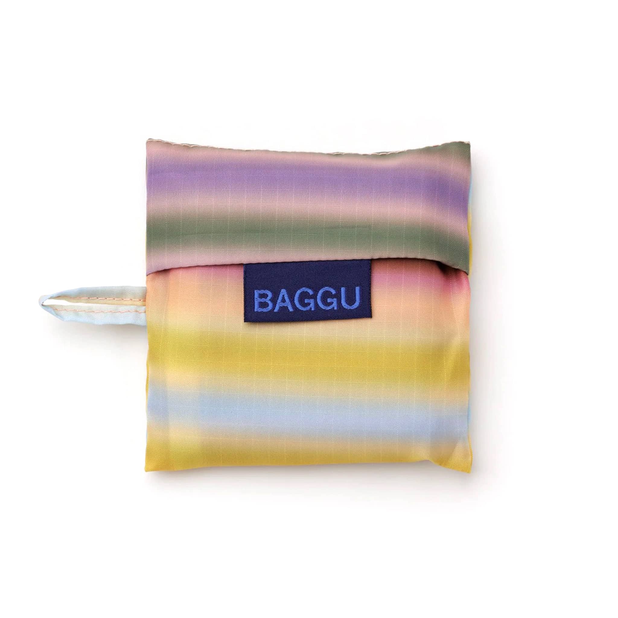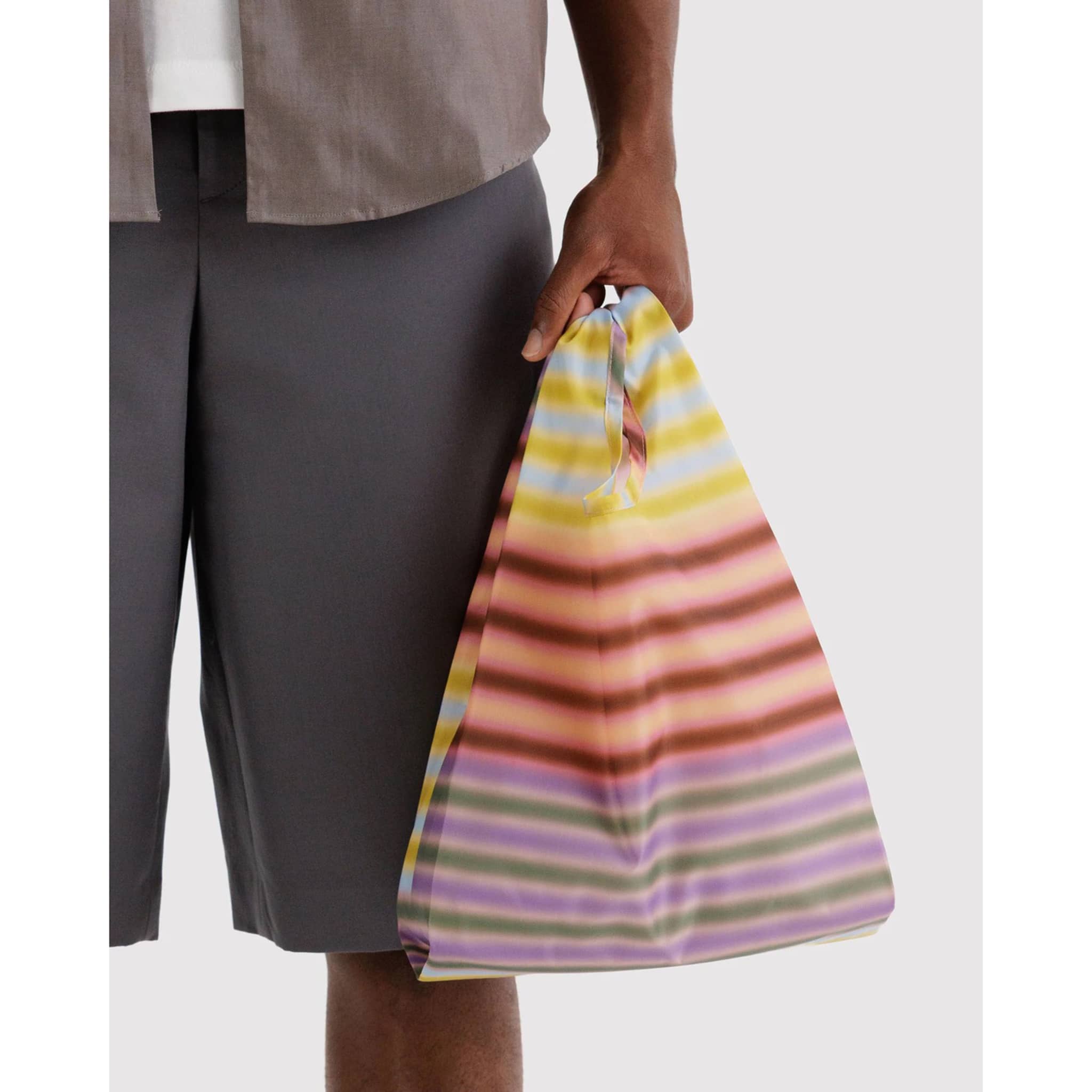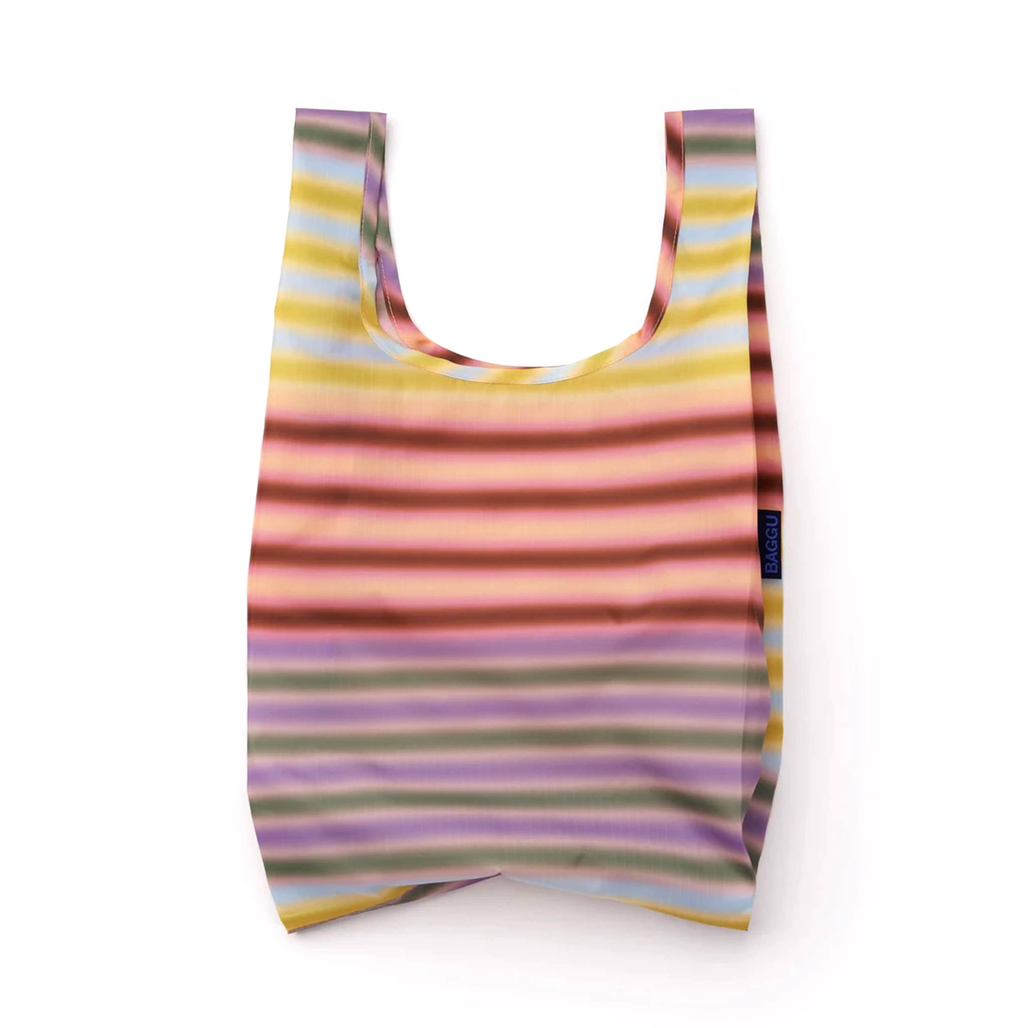 A smaller version of BAGGU's original reusable shopping bag. Perfect for your lunch, a six-pack, extra shoes, or a trip to the corner store. This tote features the horizontal Gradient Stripe Multi print. Built-in straps for hand carrying allow you to hold up to 40 lbs comfortably in your hand. 18 x 10 x 4 inch bag folds into a flat 4 x 4 inch pouch.