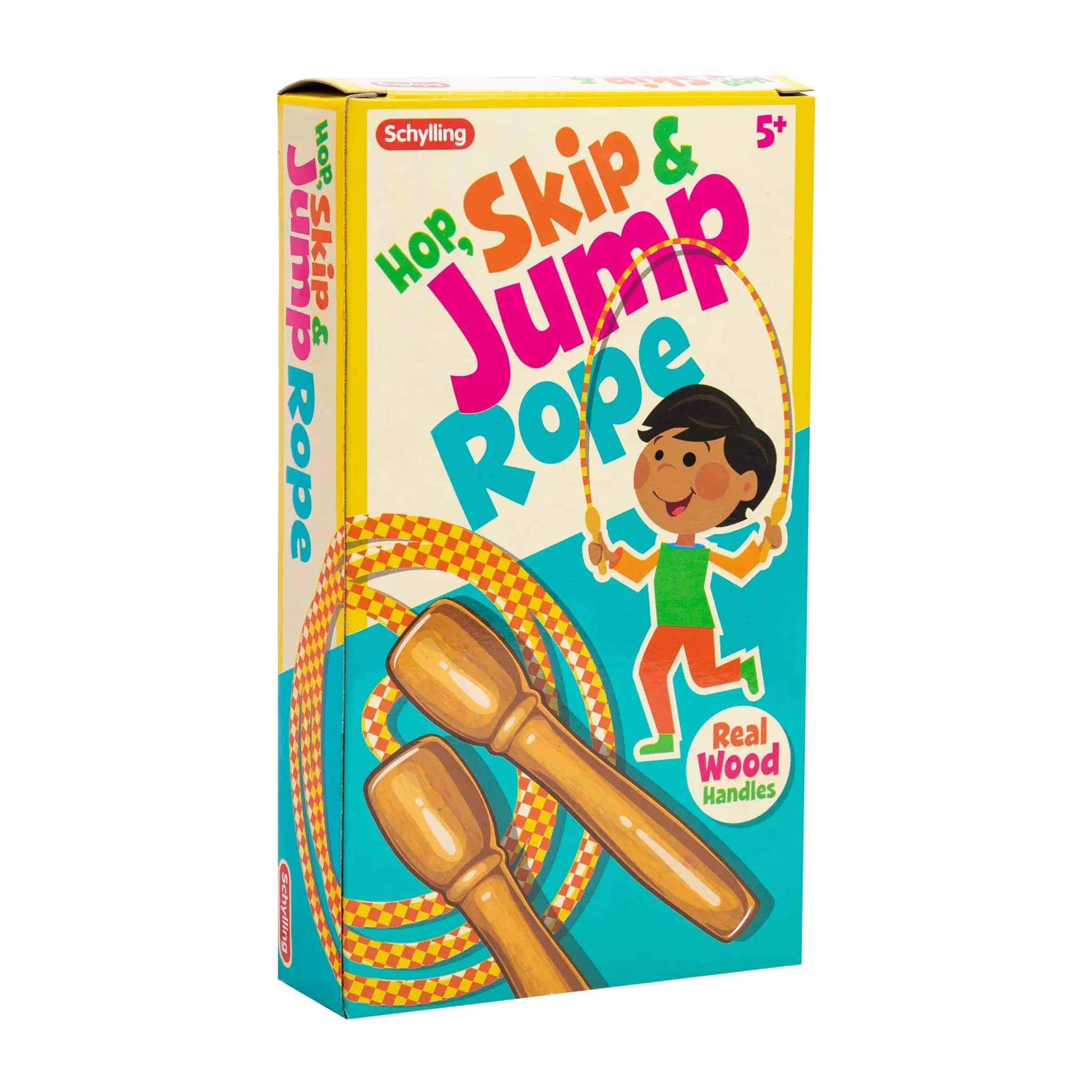 This retro skipping rope has all the classic styling from your youth and can be used for exercise or playtime! Solid natural wood 6 inch handles with an 82 inch braided, colorful rope attached. Ages 5 and up. Great for outdoor or indoor use all year round!
