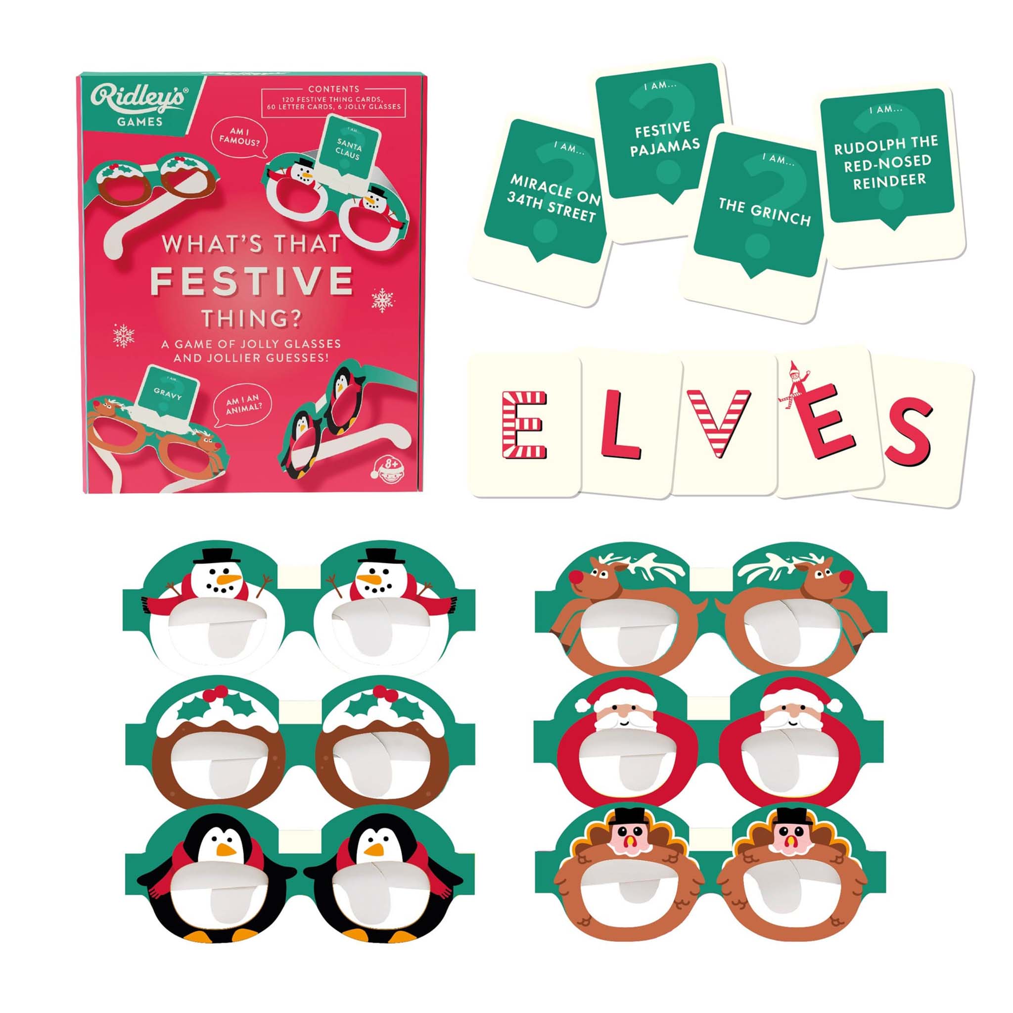 The box contains 120 Festive Thing cards, 60 Letter cards, 6 pairs of festive card glasses, and instructions. Suitable for ages 8 and up.