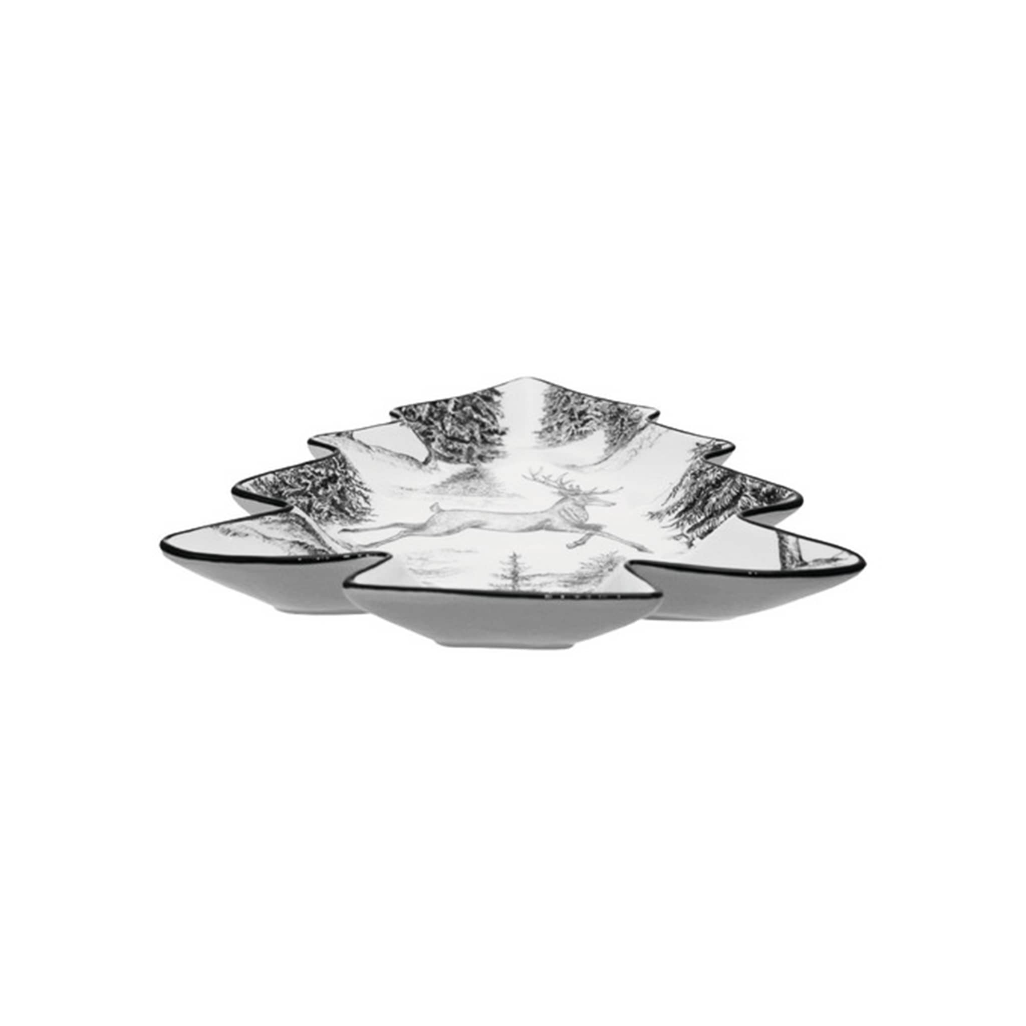 Bring rustic charm to your winter table with this tree-shaped cream ceramic plate featuring a detailed woodland scene and a leaping deer in brown. Finished with a coordinating brown edge, this festive plate blends timeless style with nature-inspired design. Perfect for serving appetizers, desserts, or holiday treats, it adds a warm and elegant touch to seasonal gatherings and rustic farmhouse décor. Measures 12 inches long x 9.75 inches wide. Pair with the matching mug for a beautiful table setting.