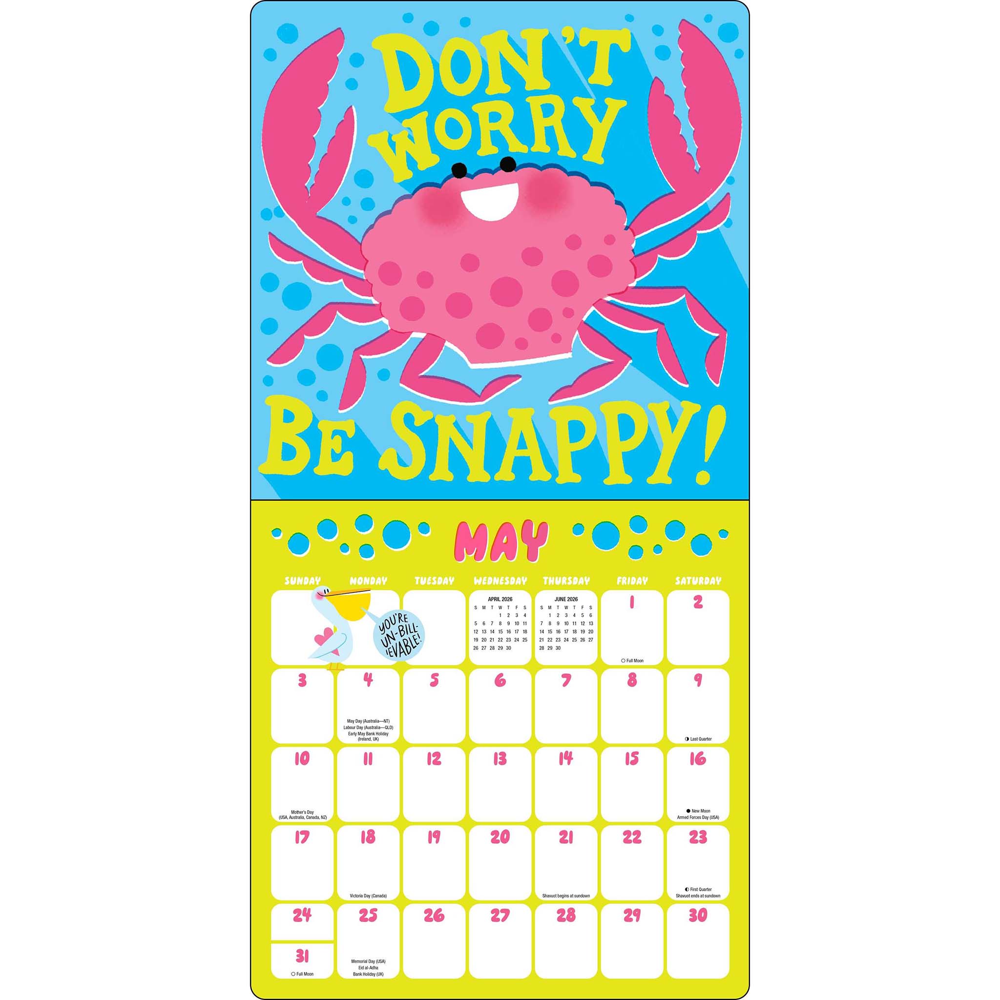Chock full of rousing puns alongside joyful, energetic illustrations, this heartwarming, uplifting 12-month calendar from Hello!Lucky will make 2026 a breeze. “Goat for it!” cheers the goat, “You’re inkcredible!” exclaims the octopus. Just remember, no matter what, time flies when you’re having pun!