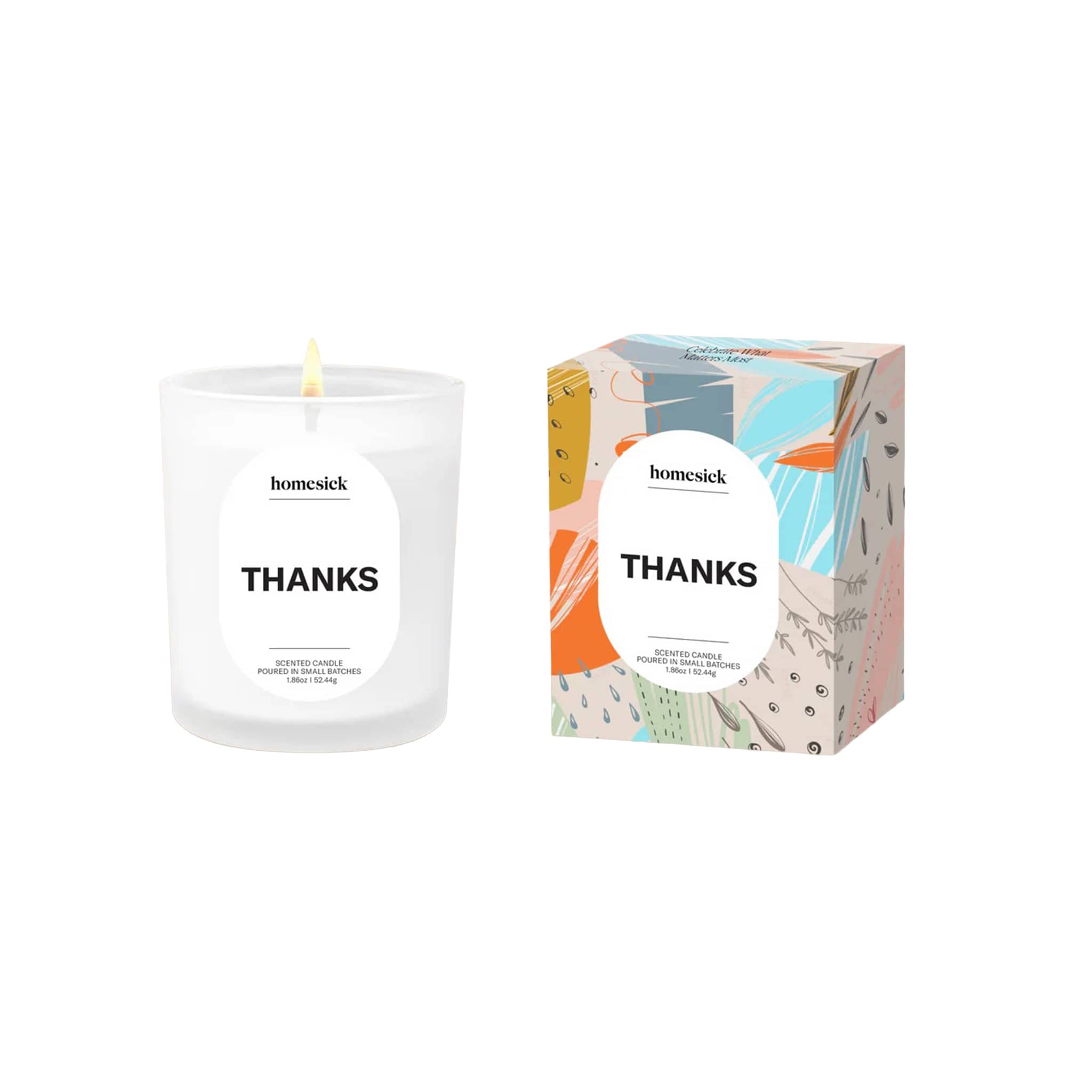 Made with a natural soy wax blend with 100% premium cotton wick for a smooth, long-lasting, clean burn. This candle is made in small batches with custom fragrance oils and hand poured in the USA. Non-toxic with no lead, plastics, paraben, phthalates or synthetic dyes. The Homesick Thanks Mini Candle comes in a frosted glass vessel that's packaged inside a colorfully illustrated gift box. Makes a great thank you gift!