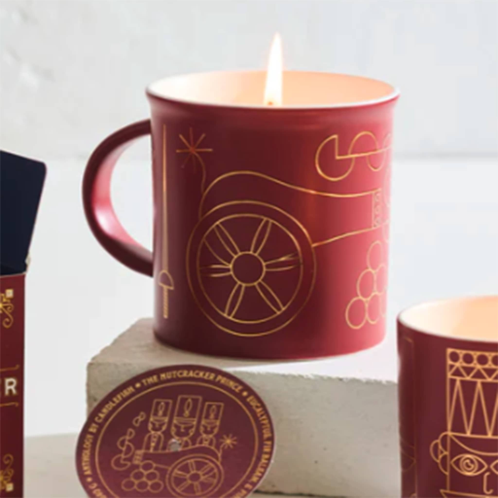 From Candlefish's Nutcracker Collection comes The Nutcracker Prince Candle Mug. The scent unveils an enchanting blend of eucalyptus, evoking a crisp winter’s breeze, fir balsam offering the comforting aroma of a holiday forest, and pine lending a timeless and magical essence, perfectly capturing the spirit of this beloved tale in a fragrant narrative. The 12-ounce porcelain deep red mug with gold foil design can be reused as a holiday mug for years to come!