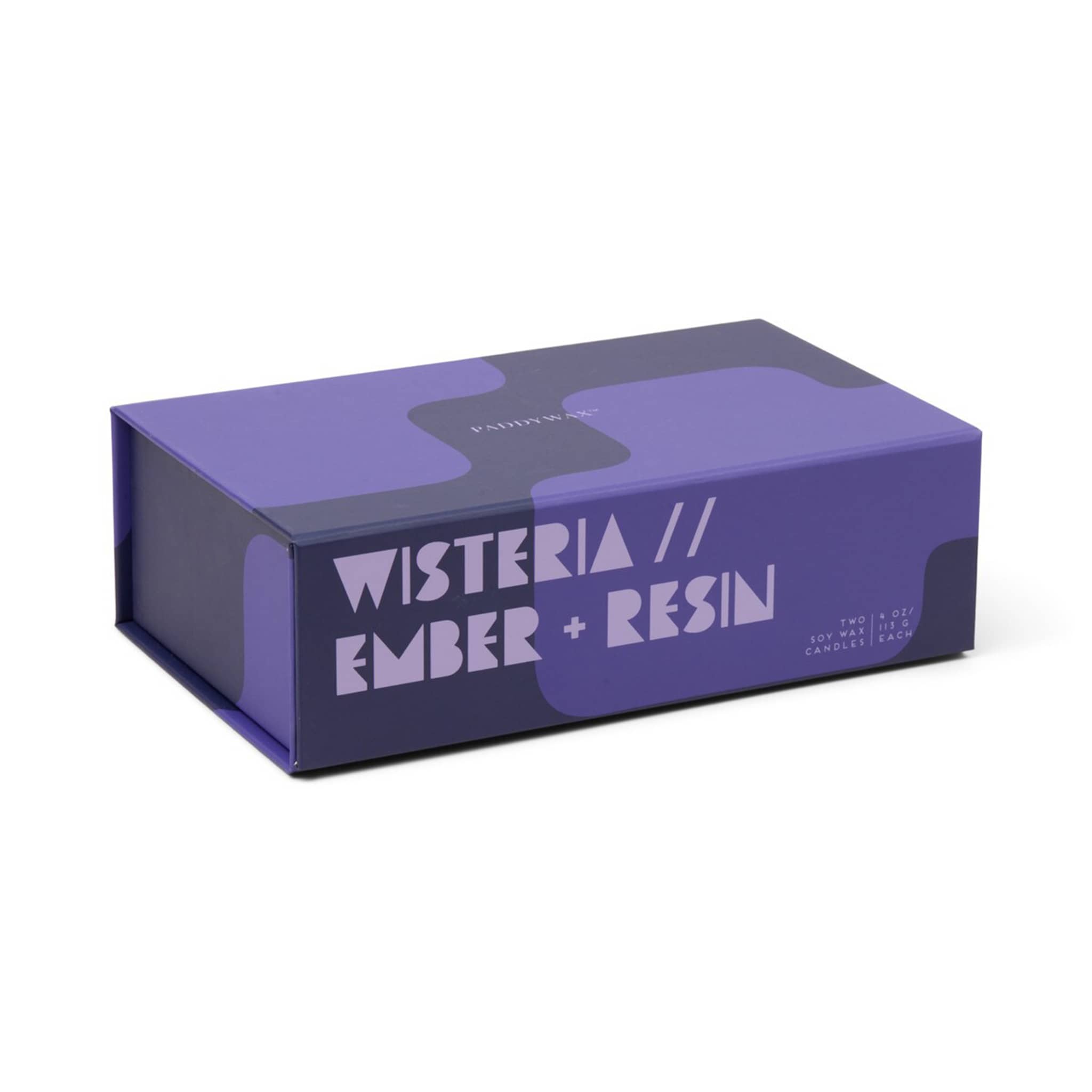 The Wisteria and Ember + Resin Jigsaw Boxed Candle Set pairs two floral fragrances in bold lavender and cobalt 4-ounce ceramic vessels. Wisteria offers soft, sweet floral notes, while Ember + Resin adds classic spice notes. Each vessel fits together like a puzzle and comes in a gift-ready magnetic box. Repurpose the vessels as stylish décor or storage after burning.