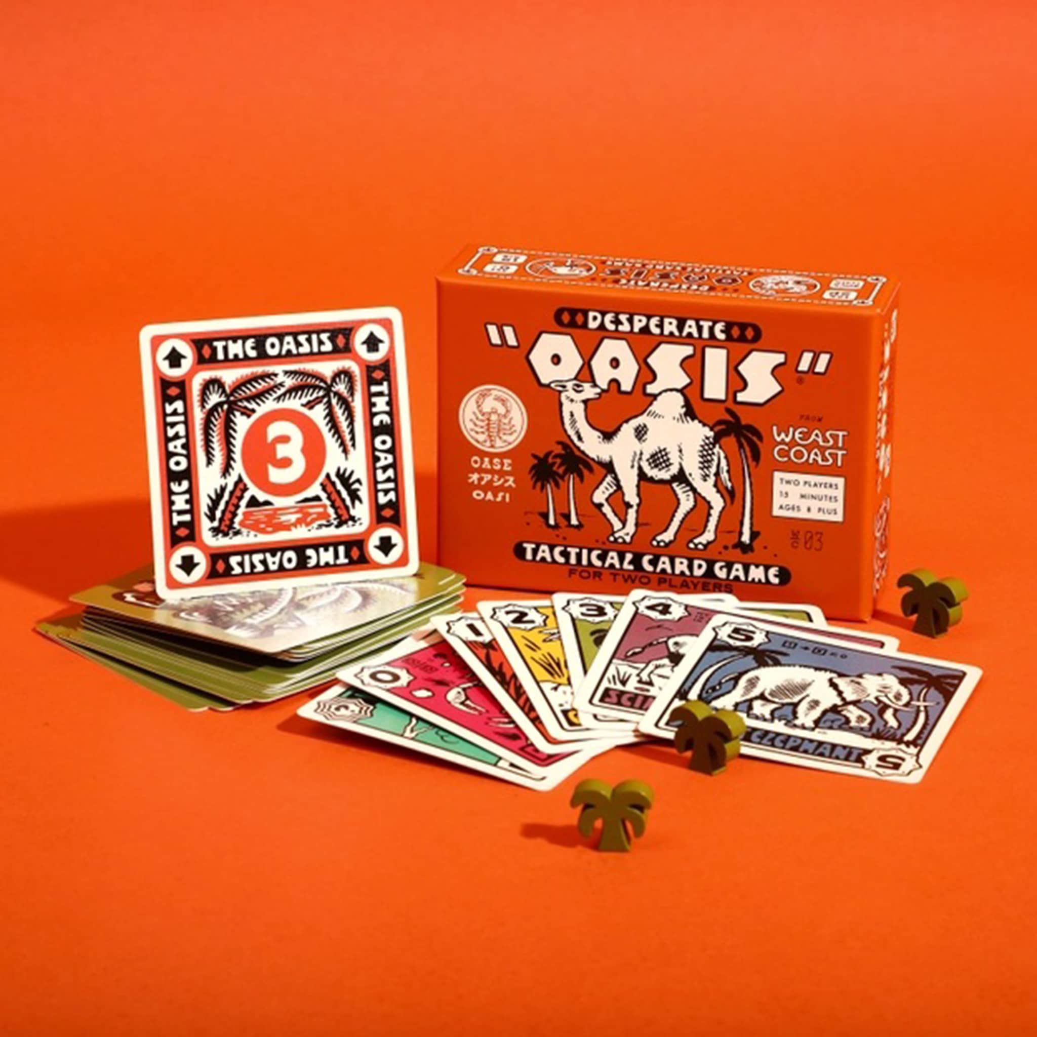 In Desperate Oasis, two players battle for control over lush, life-sustaining sanctuaries of the desert. By playing and grouping animal cards, players can show their strength, unlock special powers, and use palm trees to increase card values. Special spatial rules pull similar animals together, allowing for the manipulation of card positions. Whoever has the most points after three rounds rules the desert! Average game play is 15 minutes, suitable for ages 8 and up.