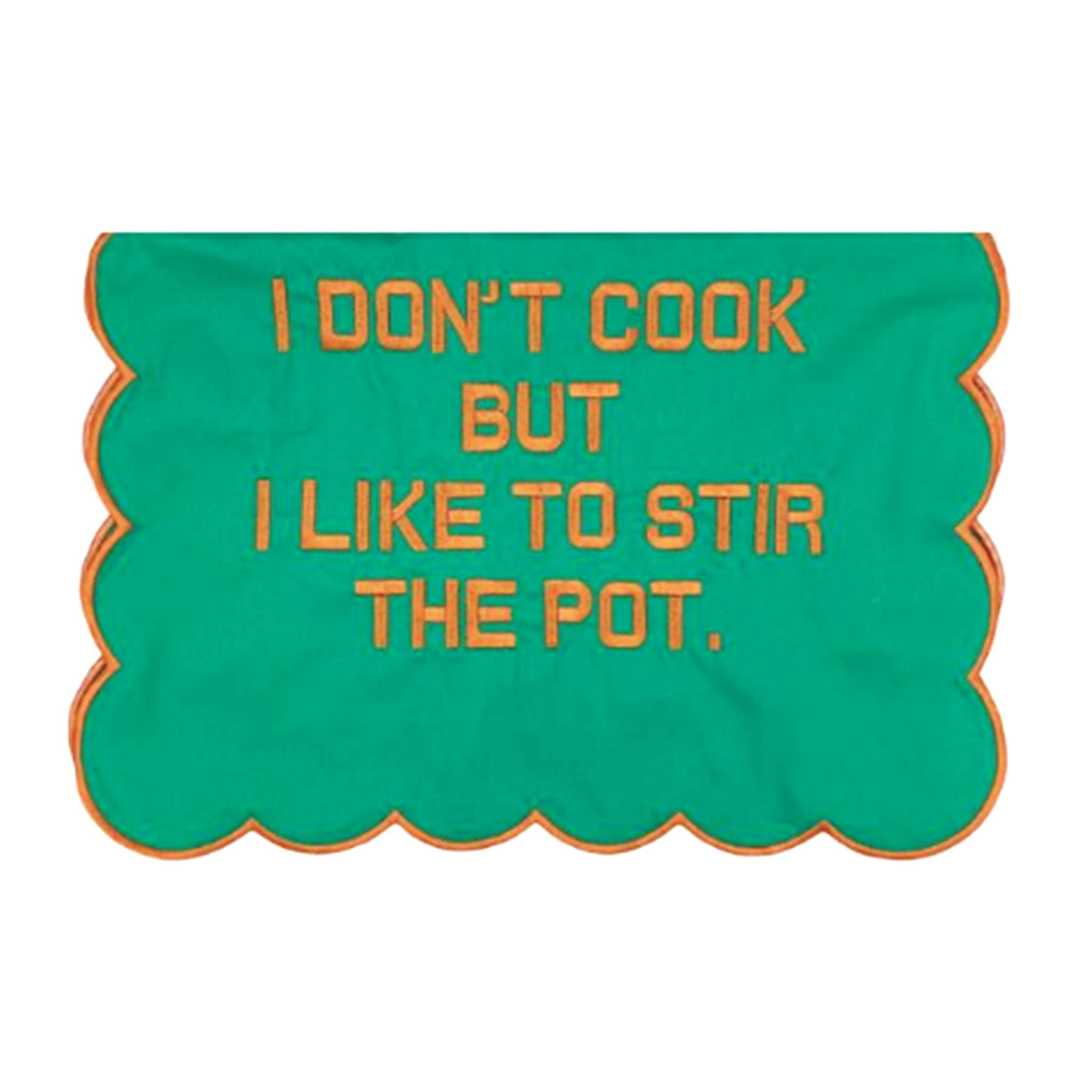 This tea towel says "I don't cook but I like to stir the pot" in orange lettering on a green backdrop with orange trim. Tea Towel measures 18 x 24 inches.