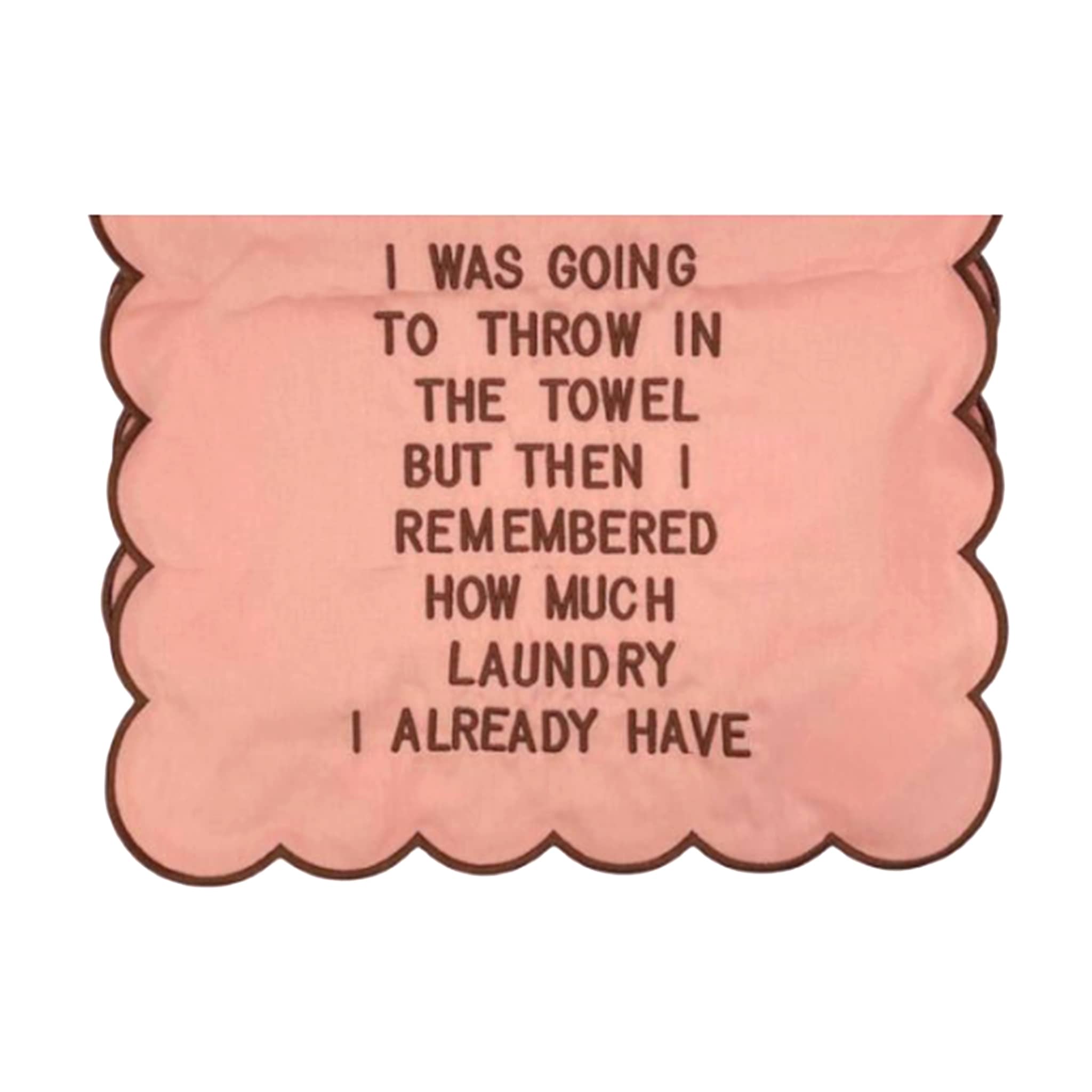 This tea towel says "I was going to throw in the towel but then I remembered how much laundry I already have" in brown lettering on a dusty pink backdrop with brown trim. Tea Towel measures 18 x 24 inches.