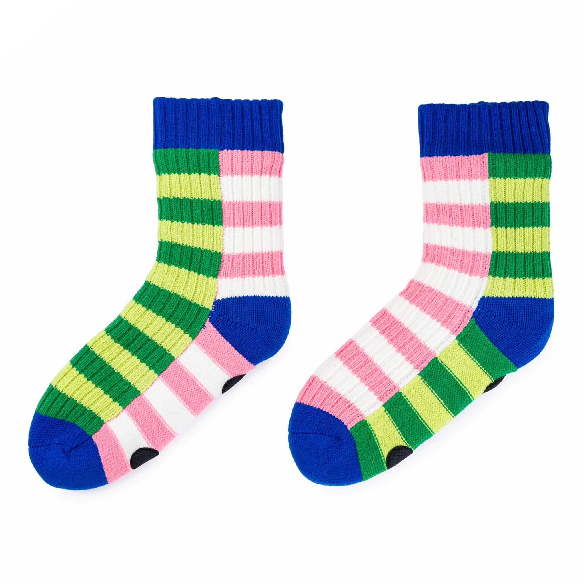 These unisex fleece-lined knit slipper socks are the best of both worlds! The easy fit of socks meets the plush comfort of house slippers. Lime and green super striped house socks with contrast heel, toe, and cuff are meant to mix and match, and keep you cozy (and bright) indoors. These soft-knit socks feature a fluffy faux fleece lining and slip-resistant patches on the sole. The body is made from 100% soft acrylic and the lining is polyester fleece. Machine wash cold, gentle cycle, tumble dry low.