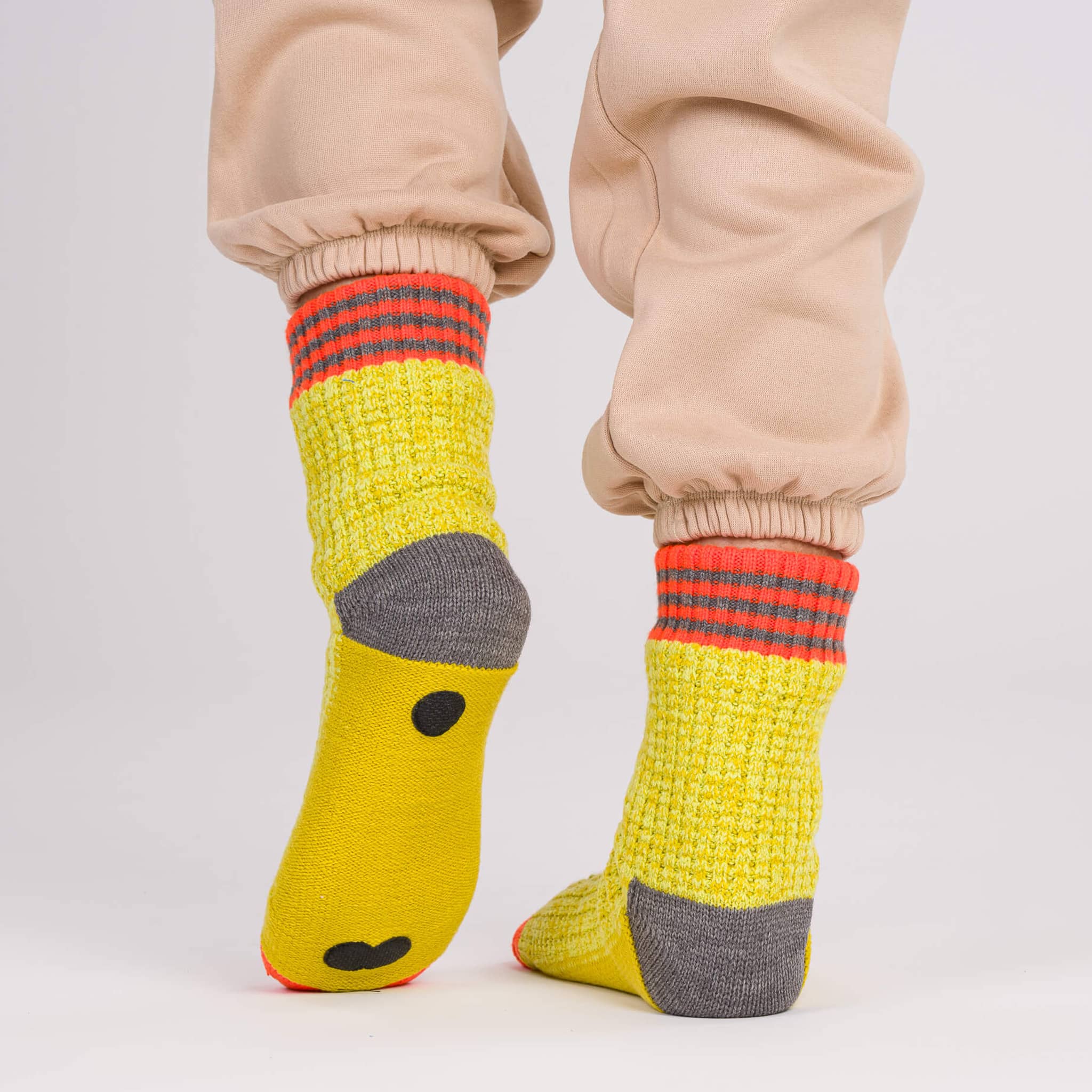 These unisex fleece-lined knit slipper socks are the best of both worlds! The easy fit of socks meets the plush comfort of house slippers. Sporty Varsity waffle knit with contrasting striped cuff in Golden Olive will keep you cozy (and bright) indoors. These soft-knit socks feature a fluffy faux fleece lining and slip-resistant patches on the sole. The body is made from 100% soft acrylic and the lining is polyester fleece. Machine wash cold, gentle cycle, tumble dry low.