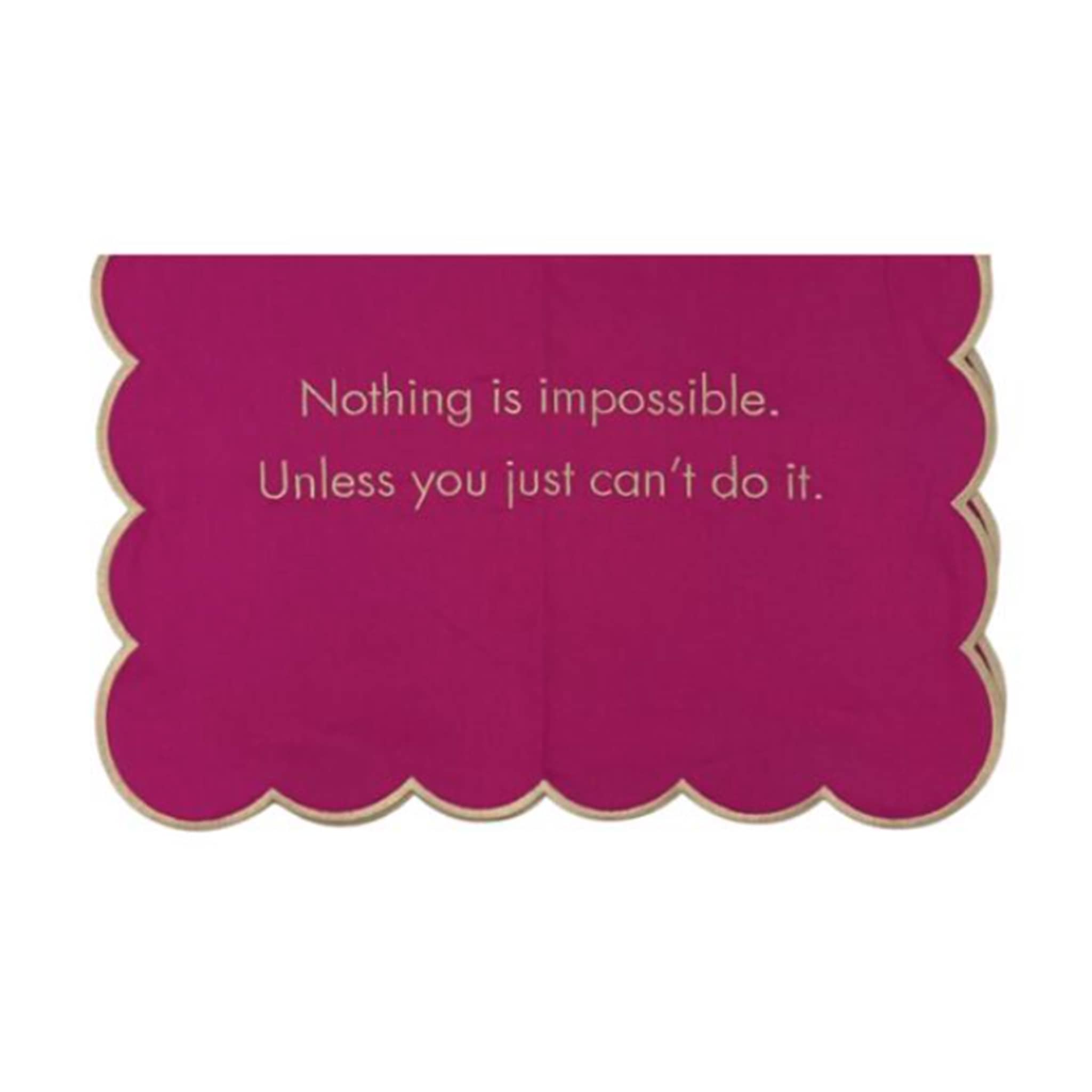 This tea towel says "Nothing is impossible. Unless you just can't do it." in beige lettering on a dark pink backdrop with beige trim. Tea Towel measures 18 x 24 inches.