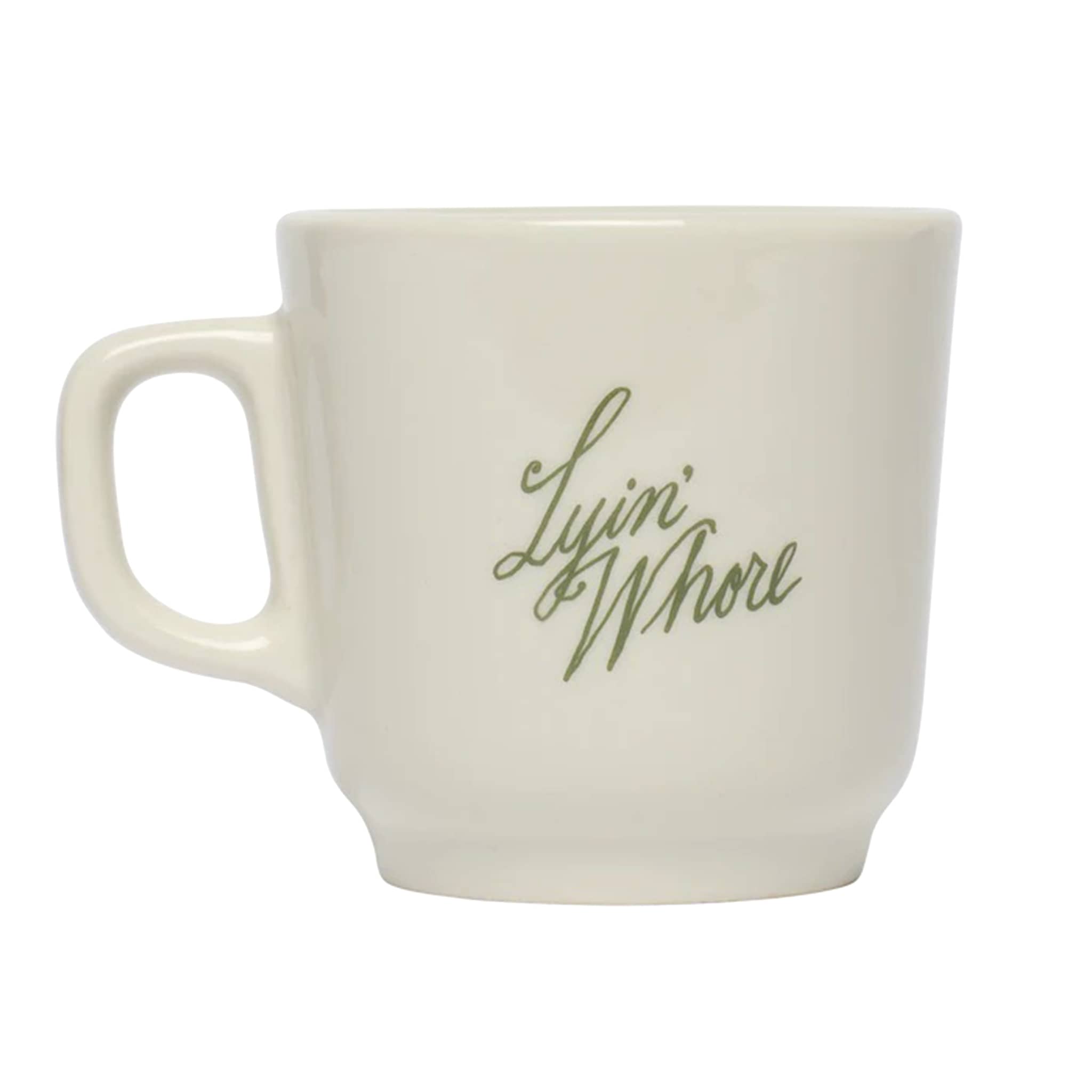 Subtlety is overrated. Say it with this mug. This hilarious mug says "Lyin' Whore" in green script lettering on the front. Made from glazed and triple-fired stoneware, the non-porous surface is dishwasher and microwave-safe. This mug is part of the Pleasantries line from Fish's Eddy, products with absolutely no filter! Mug measures 4.875 inches wide x 4.625 inches tall and holds 12 ounces of coffee or tea.