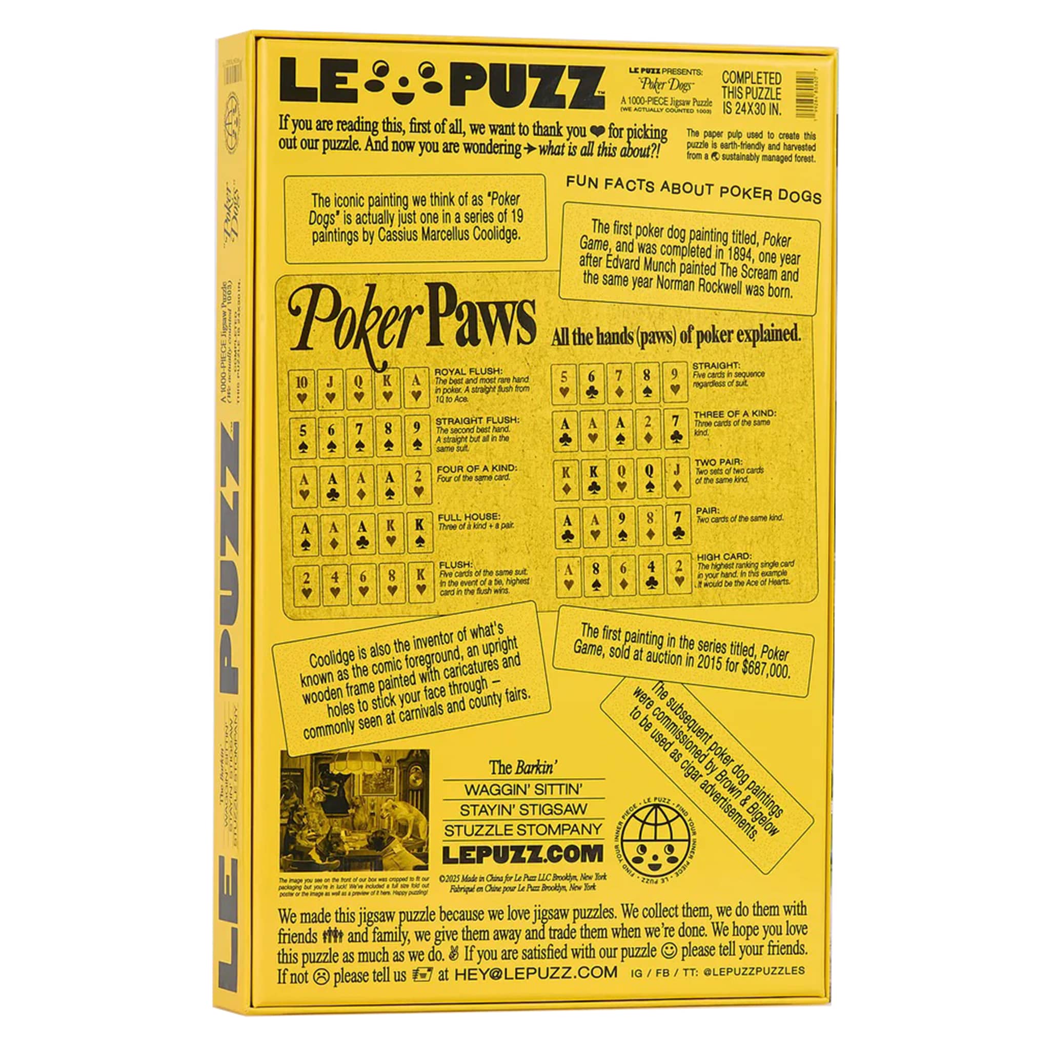 Le Puzz's homage to the classic American kitsch painting "Poker Game" from 1894. Wag your way through this jigsaw puzzle, it's an all paws on deck situation. Woof! The Poker Dogs puzzle is from Series 9. This 1000-piece jigsaw puzzle measures 23.62 x 30.31 inches when completed. Box includes 1000 puzzle pieces, a reusable and resealable bag, and a bonus double-sided fold-out poster. Box packaging measures 14.25 x 9 x 2 inches.