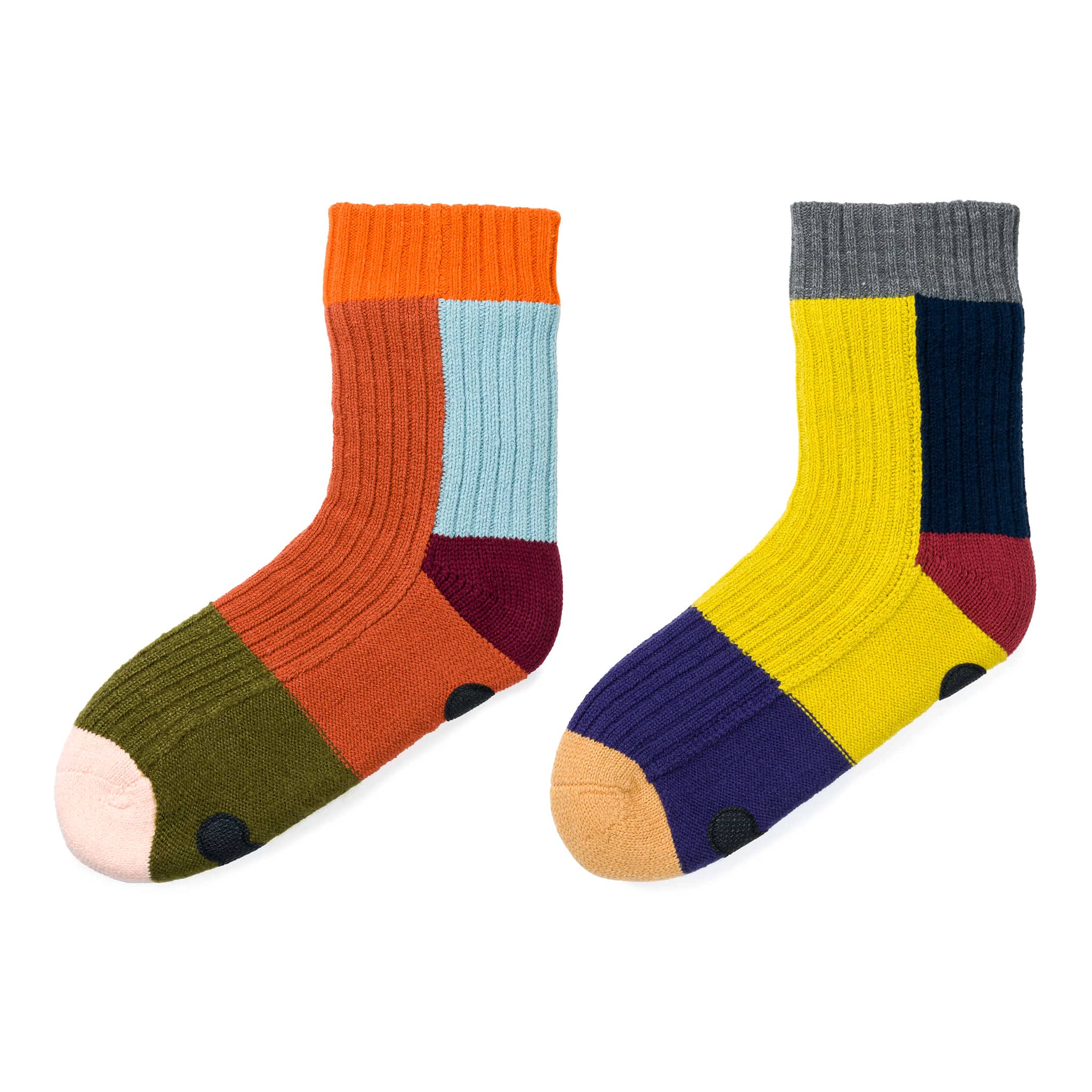 These unisex fleece-lined knit slipper socks are the best of both worlds! The easy fit of socks meets the plush comfort of house slippers. Mismatched, unexpected color combos on each foot in Desert colors will keep you cozy (and bright) indoors. These soft-knit socks feature a fluffy faux fleece lining and slip-resistant patches on the sole. The body is made from 100% soft acrylic and the lining is polyester fleece. Machine wash cold, gentle cycle, tumble dry low.