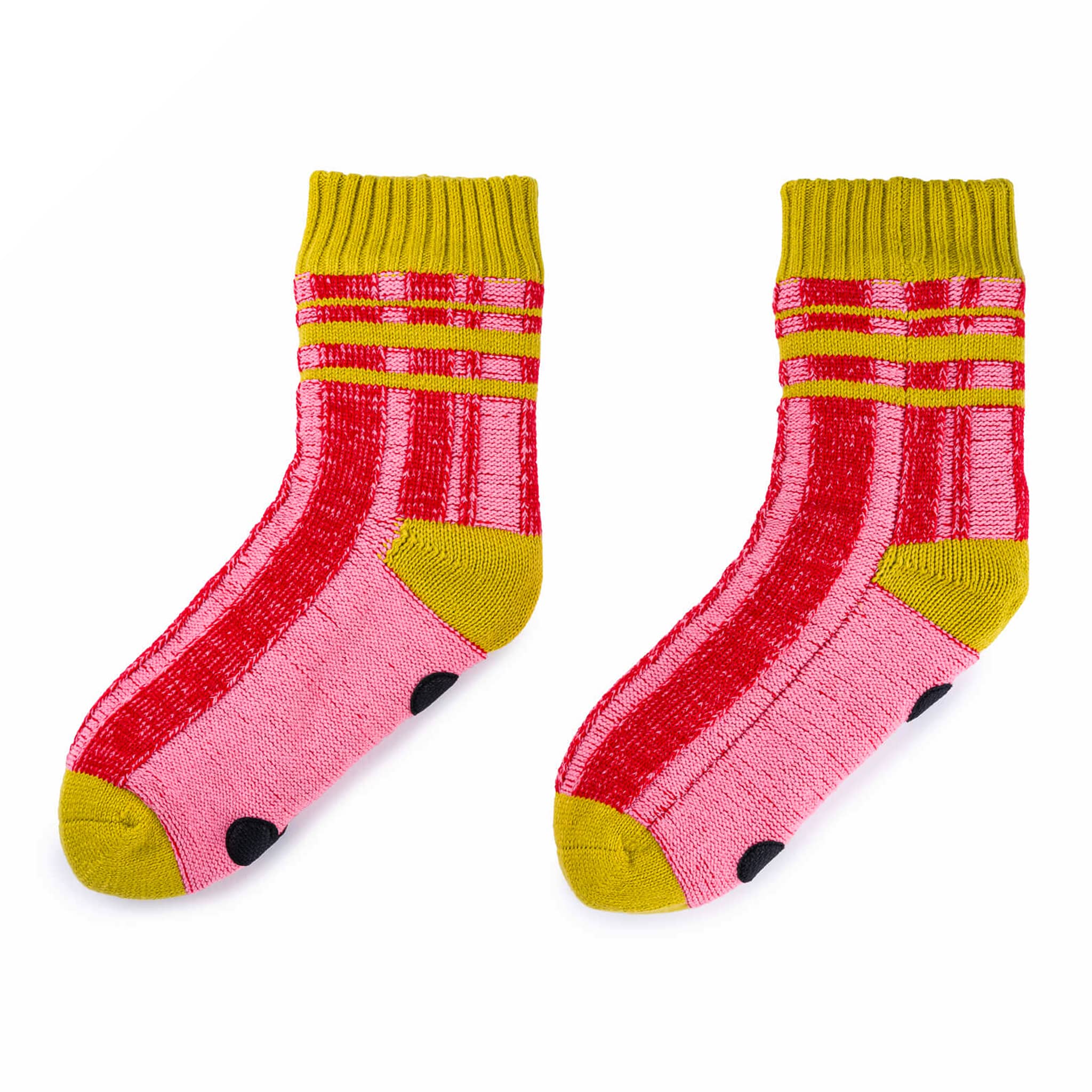 These unisex fleece-lined knit slipper socks are the best of both worlds! The easy fit of socks meets the plush comfort of house slippers. Textured plaid stripes knit in Pink and Red will keep you cozy (and bright) indoors. These soft-knit socks feature a fluffy faux fleece lining and slip-resistant patches on the sole. The body is made from 100% soft acrylic and the lining is polyester fleece. Machine wash cold, gentle cycle, tumble dry low.