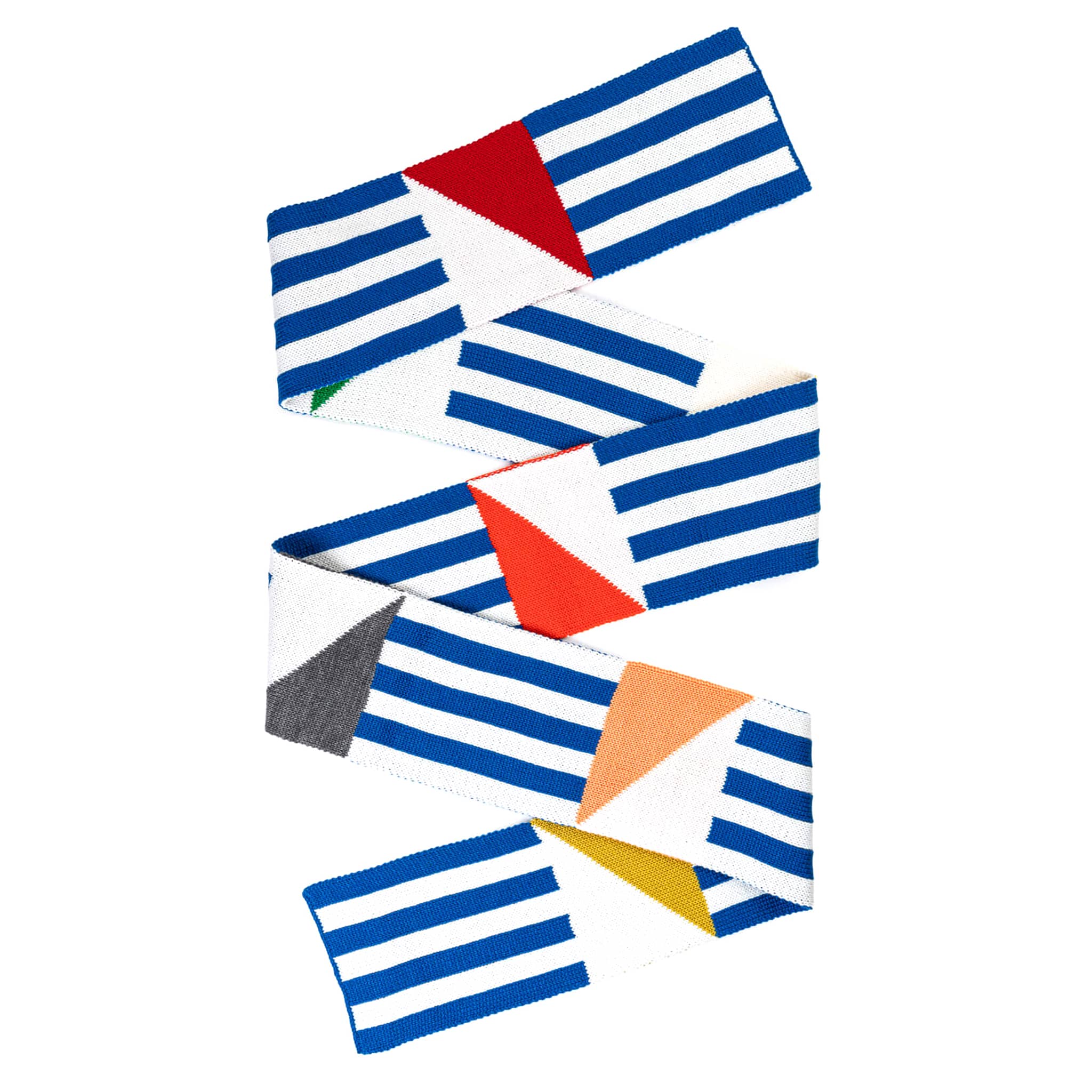 A vintage-inspired long skinny scarf knitted with alternating blocks of triangles and stripes. Colorful, reversible, and unisex. For indoor and outdoor wear. Can be tied and wrapped in many different ways depending on weather or mood. Knit with repurposed deadstock 100% soft acrylic yarn. Machine wash cold, gentle cycle, dry flat. Scarf measures 84 inches long x 5 inches wide.