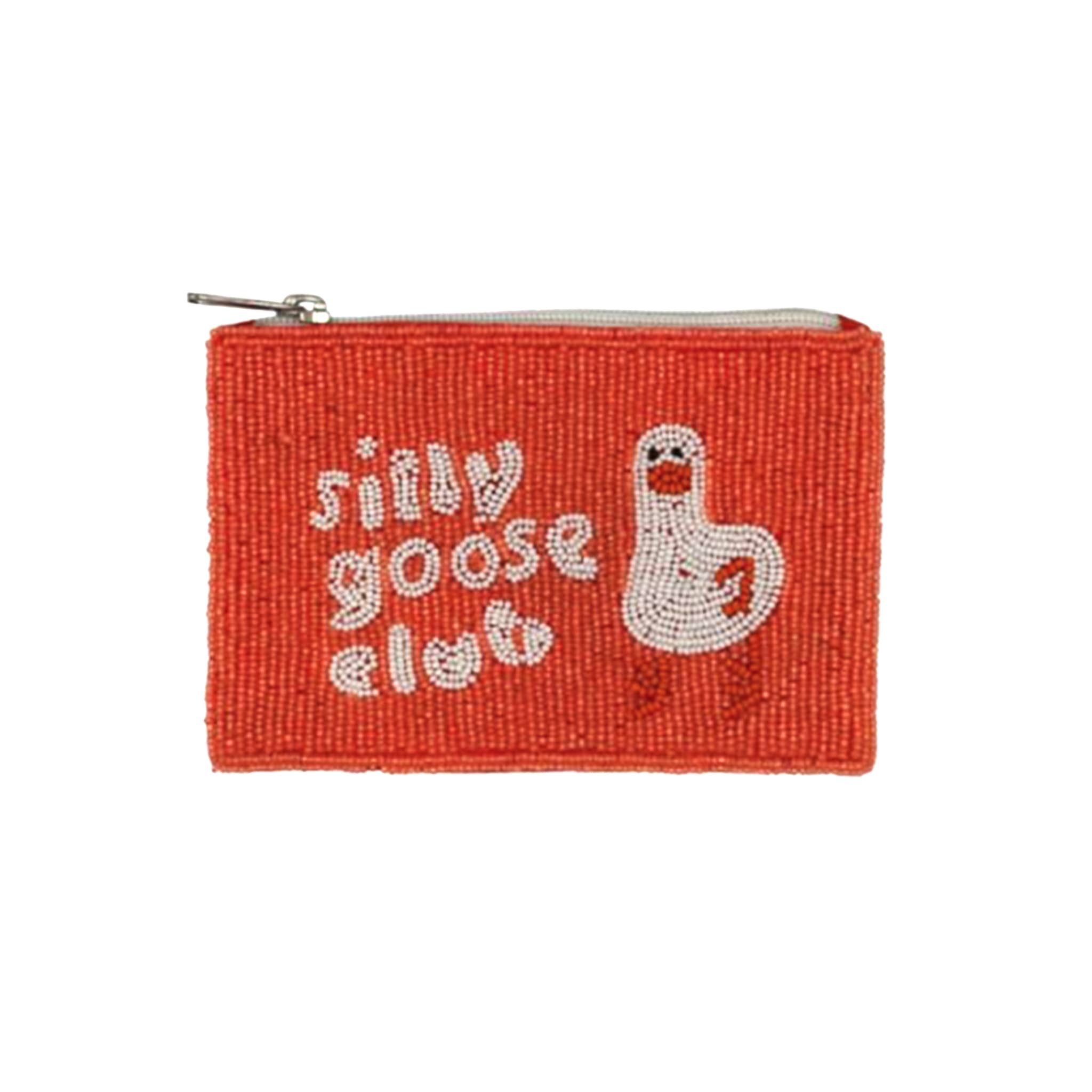 This pouch has "Silly Goose Club" in white lettering with a goose on an orange backdrop. Coin pouch measures 6 x 4 inches.