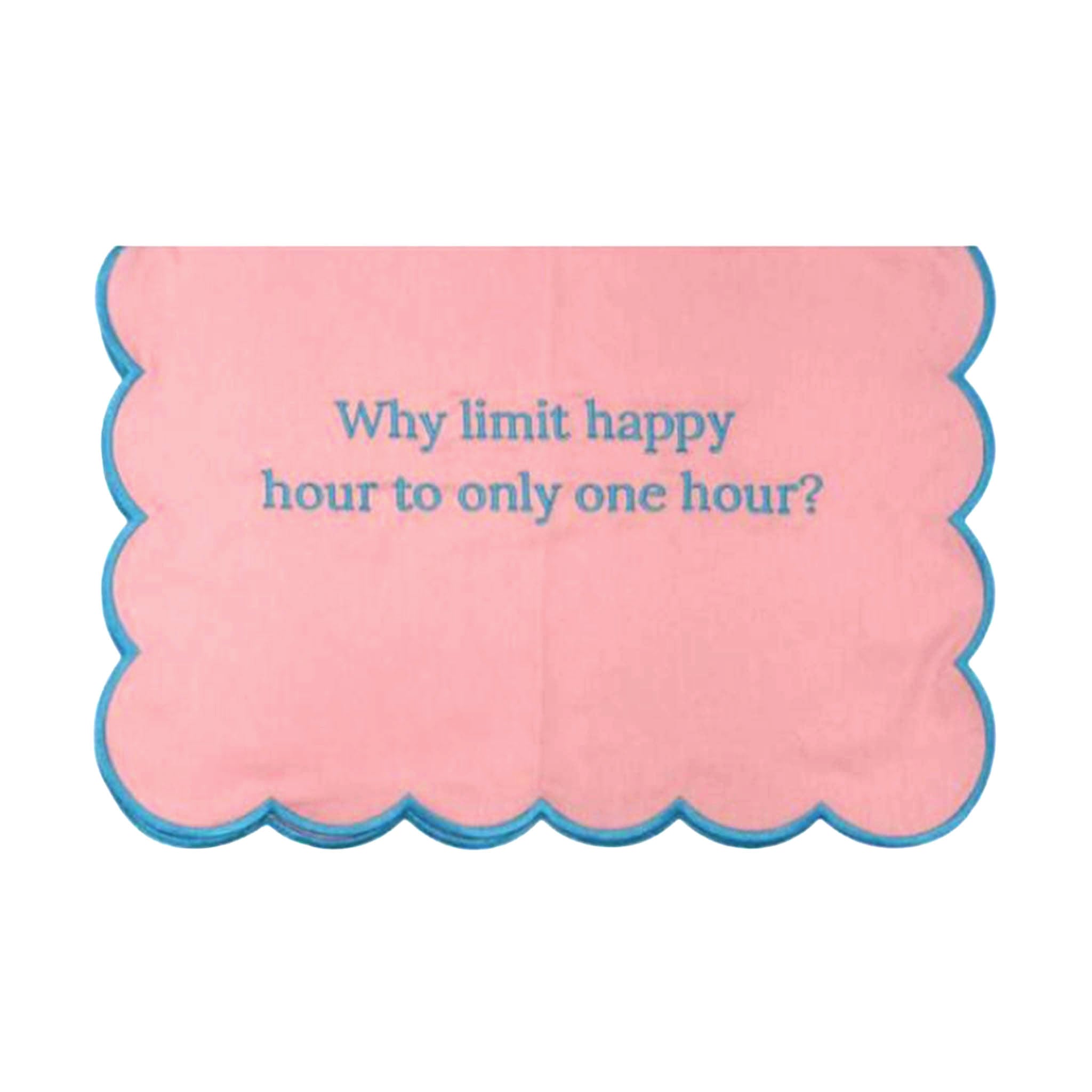 This tea towel says "Why limit happy hour to only one hour?" in aqua lettering on a dusty pink backdrop with aqua trim. Tea Towel measures 18 x 24 inches.