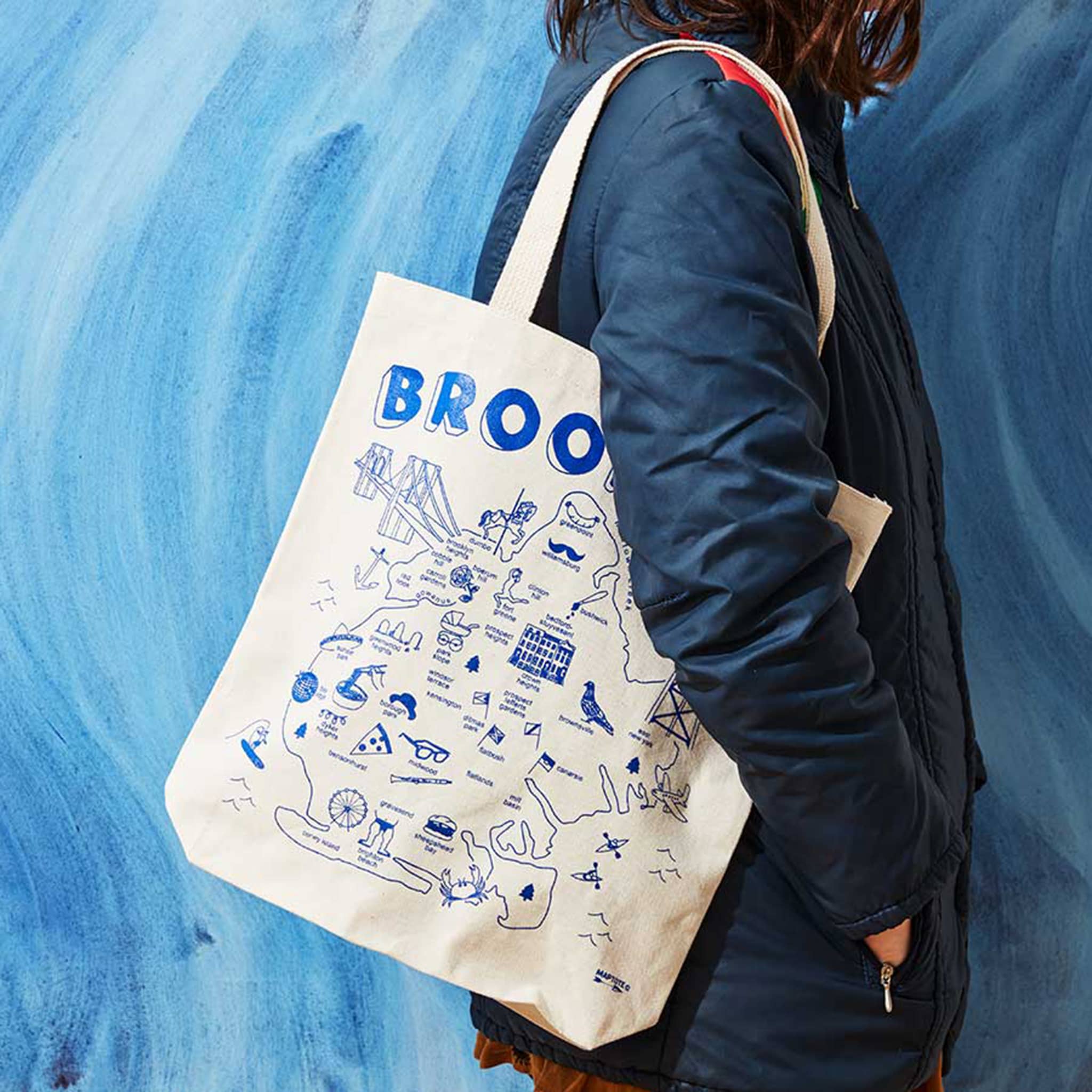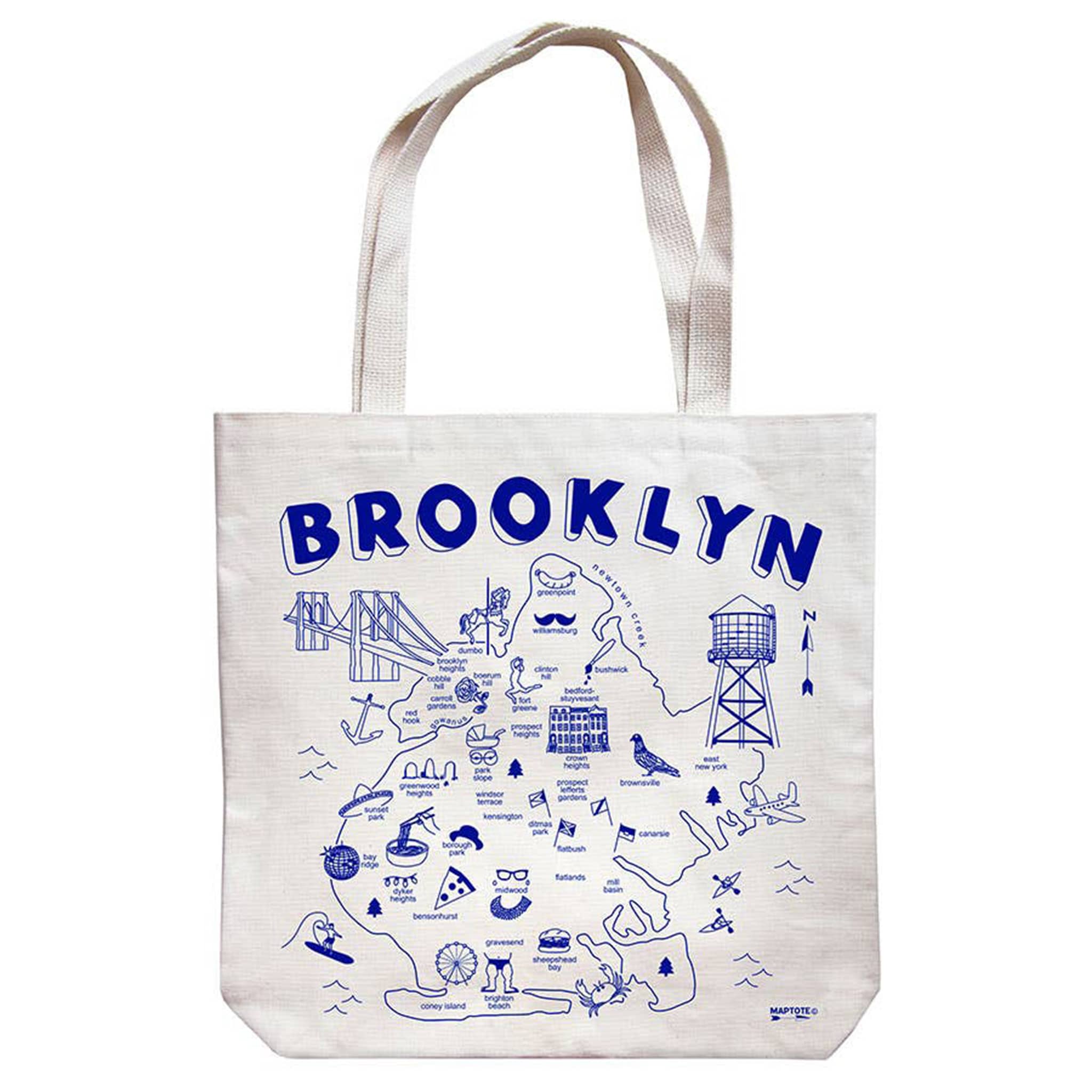 Made from 100% natural 10-ounce cotton canvas, ensuring durability and a touch of local craftsmanship. Features an exclusive map design of Brooklyn, showcasing each distinct neighborhood and landmarks. Measures approximately 15 x 14 inches with a 3-inch gusset and 21-inch handles. Includes an inside pocket for stashing small items.