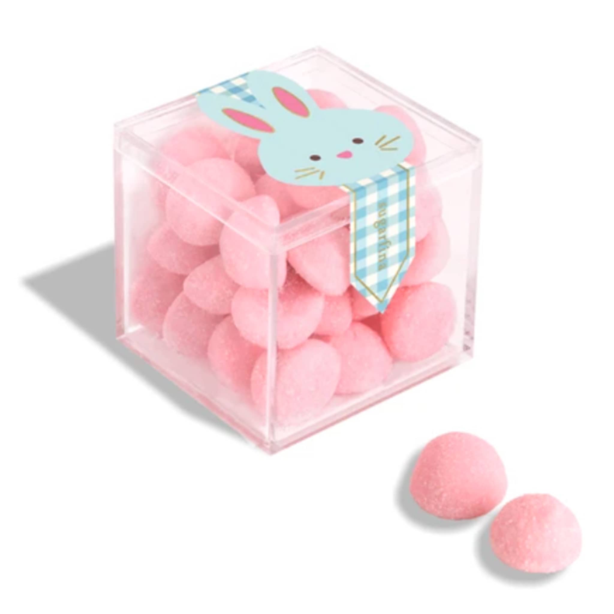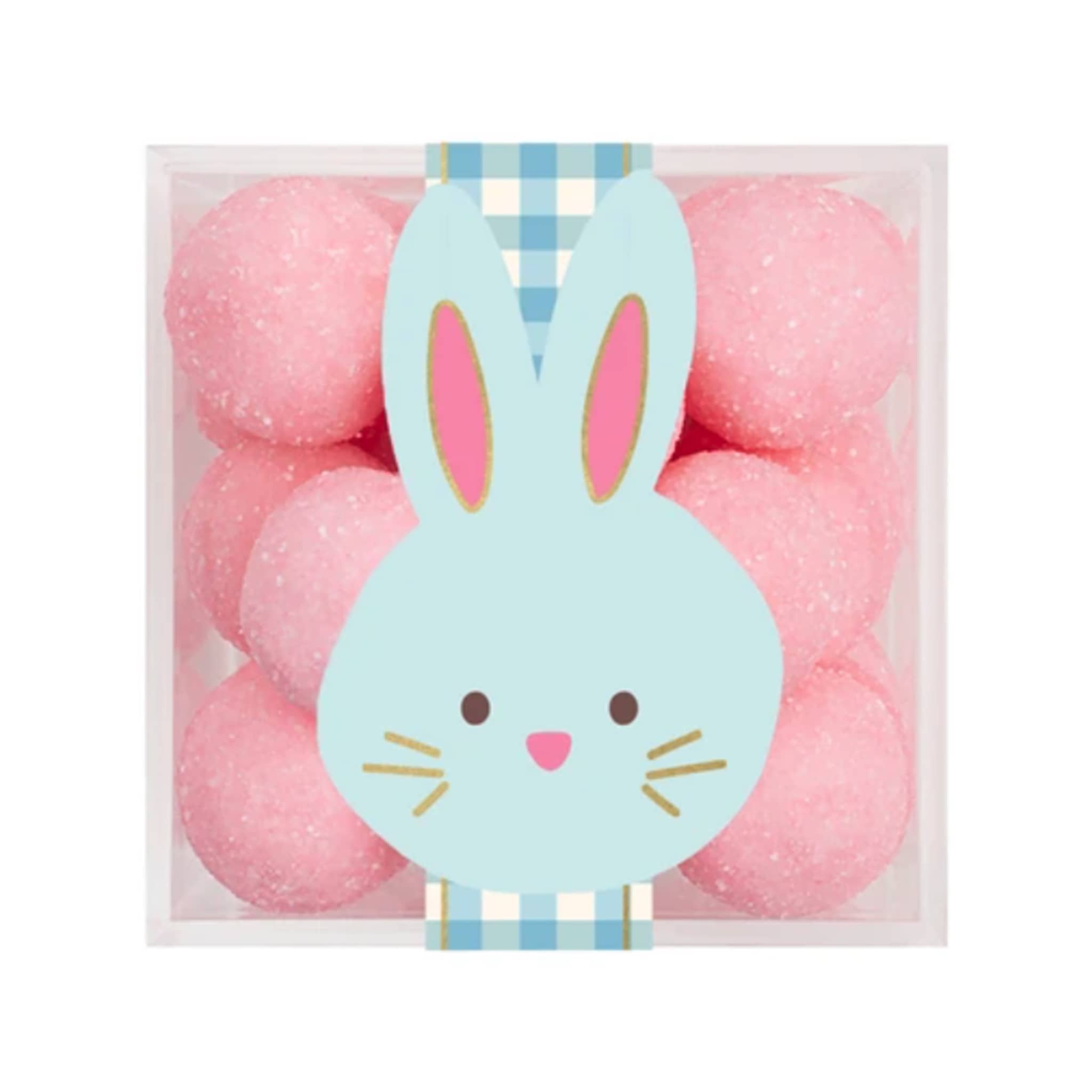 Sweet from head to tail! These fluffy strawberry-flavored candies are a soft treat that's perfectly pink. Packaged in a small candy cube with a cute blue bunny and a blue gingham ribbon seal. Makes a great addition to any egg hunt or Easter basket. Contains no artificial flavors, no artificial colors and no GMO's.