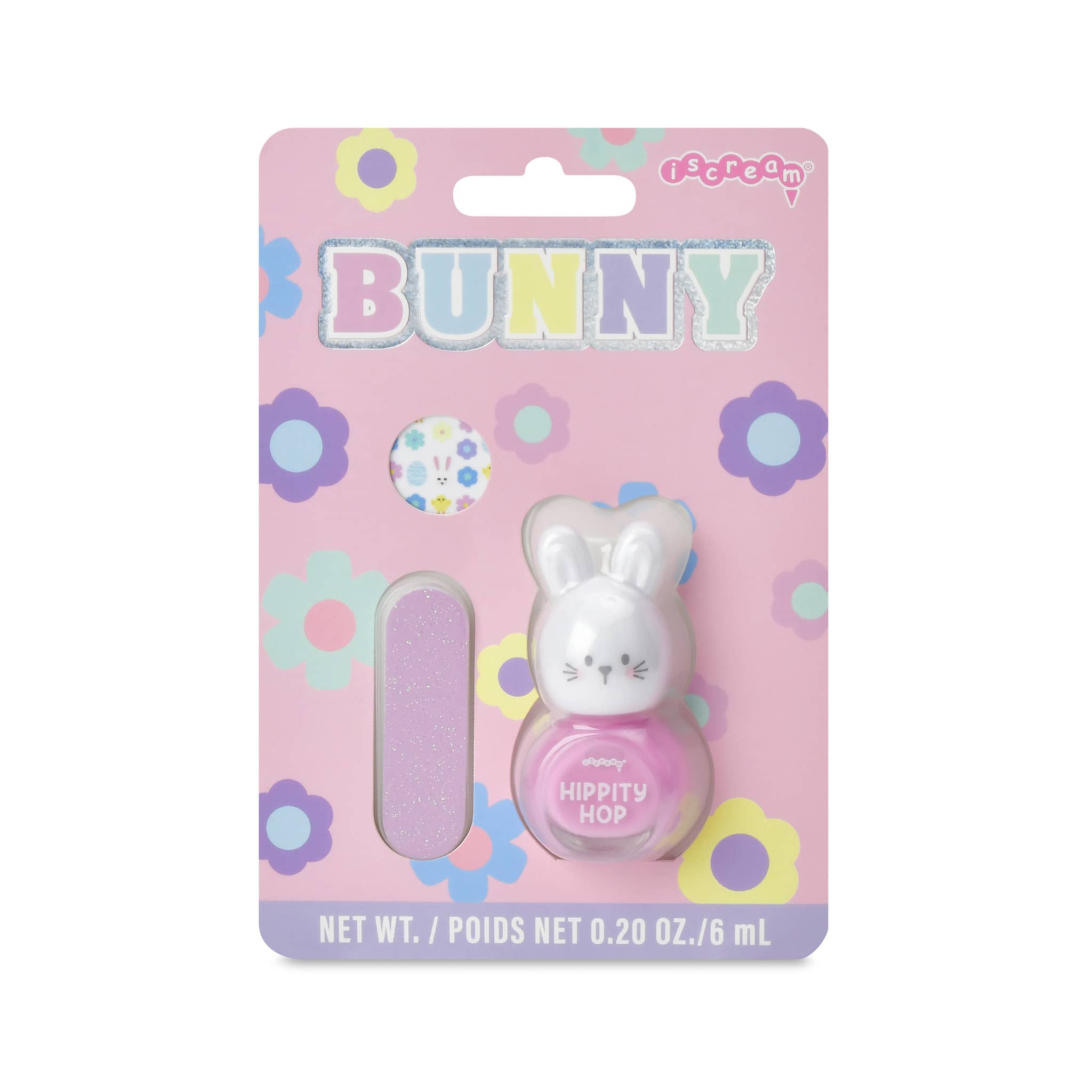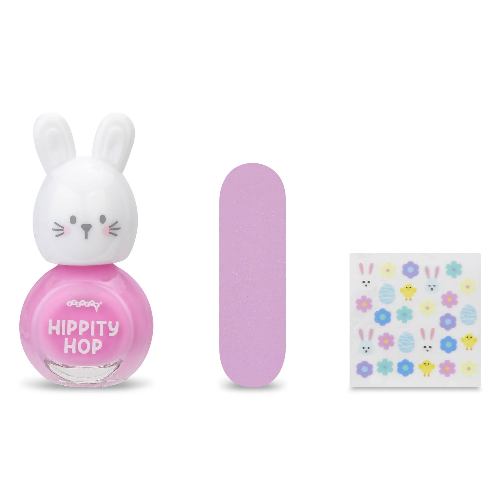 Make manicures extra fun with this adorable Bunny Nail Polish Set for kids! The set includes a bright pink nail polish featuring a cute bunny head bottle topper and playful “Hippity Hop” lettering on the bottle, adding a whimsical touch little ones will love. It also comes with a matching pink nail file for easy shaping and a sheet of colorful Easter-themed nail stickers to decorate tiny nails with festive flair.