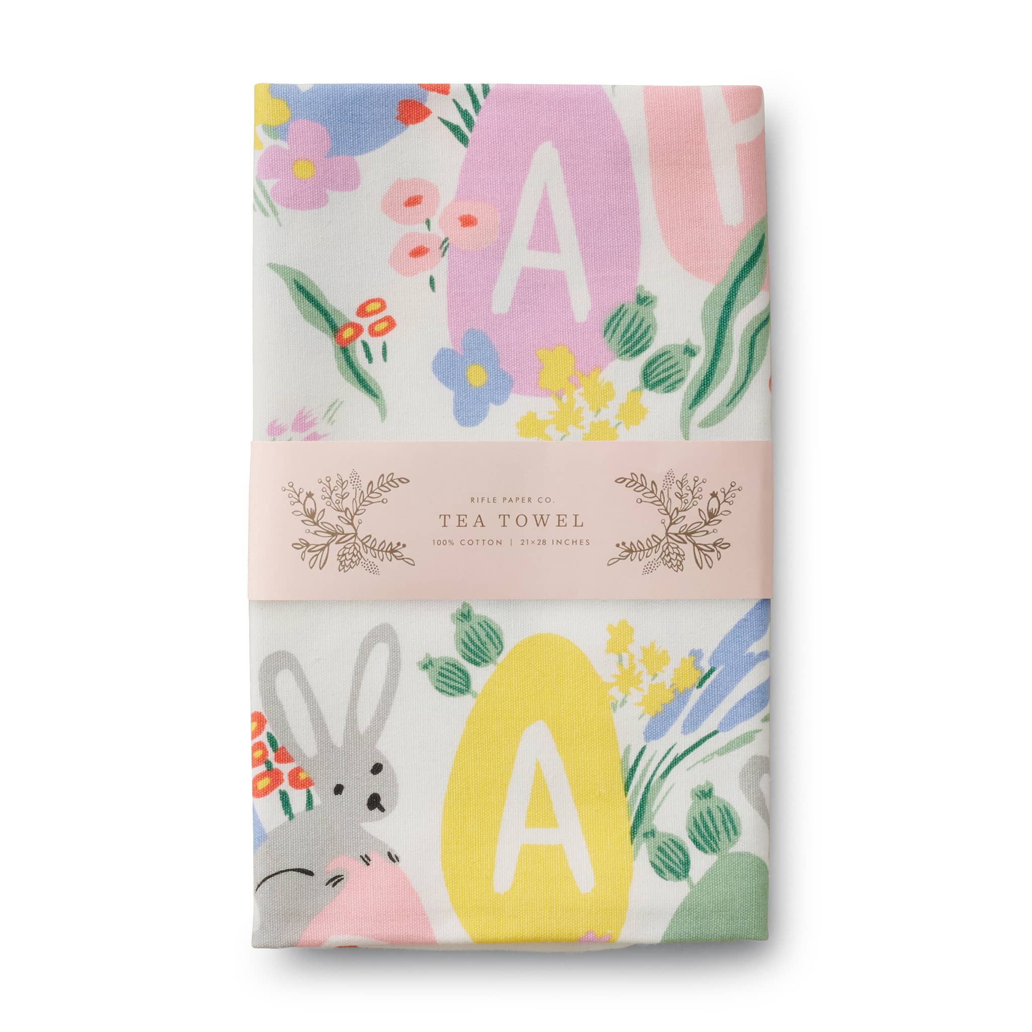 Introduce a pop of color to your kitchen or Easter celebrations with this gorgeous tea towel! Screen printed on a 100% cotton towel, the design features bunnies, flowers, and eggs that spell out "Happy Easter" in a vibrant pastel color palette. Use this kitchen towel to line a basket, dry dishes, or simply display to serve up serious culinary style. Towel measures 28 x 21 inches and features a loop for hanging. Machine-wash cold, tumble-dry low, warm iron on back if needed.