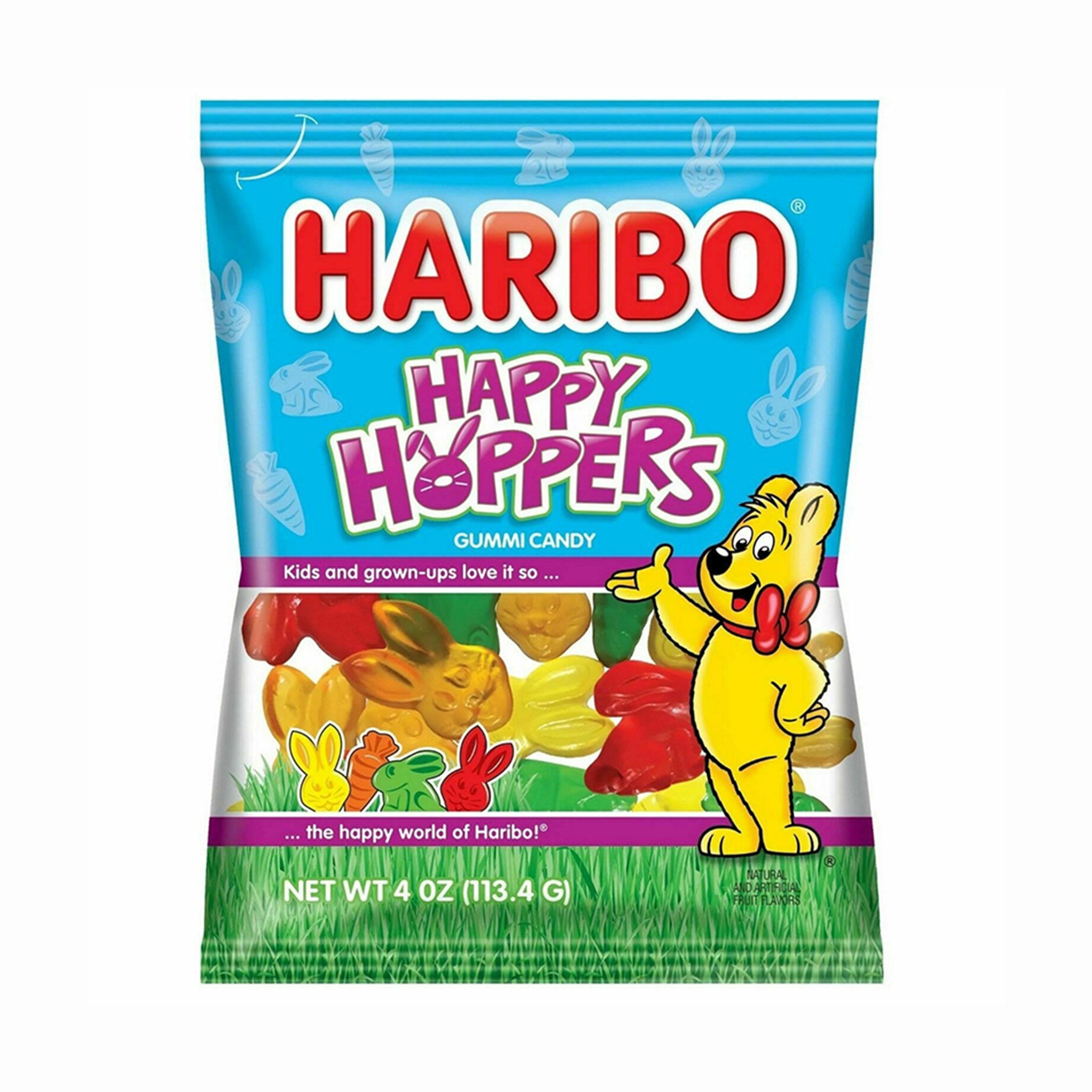 Happy Hoppers features colorful carrot and bunny shaped gummi candies from the popular line of Haribo®. Flavors in this pack include apple, orange, lemon, and strawberry. Perfectly suited for Easter baskets or as a sweet treat anytime! 4-ounce bag.