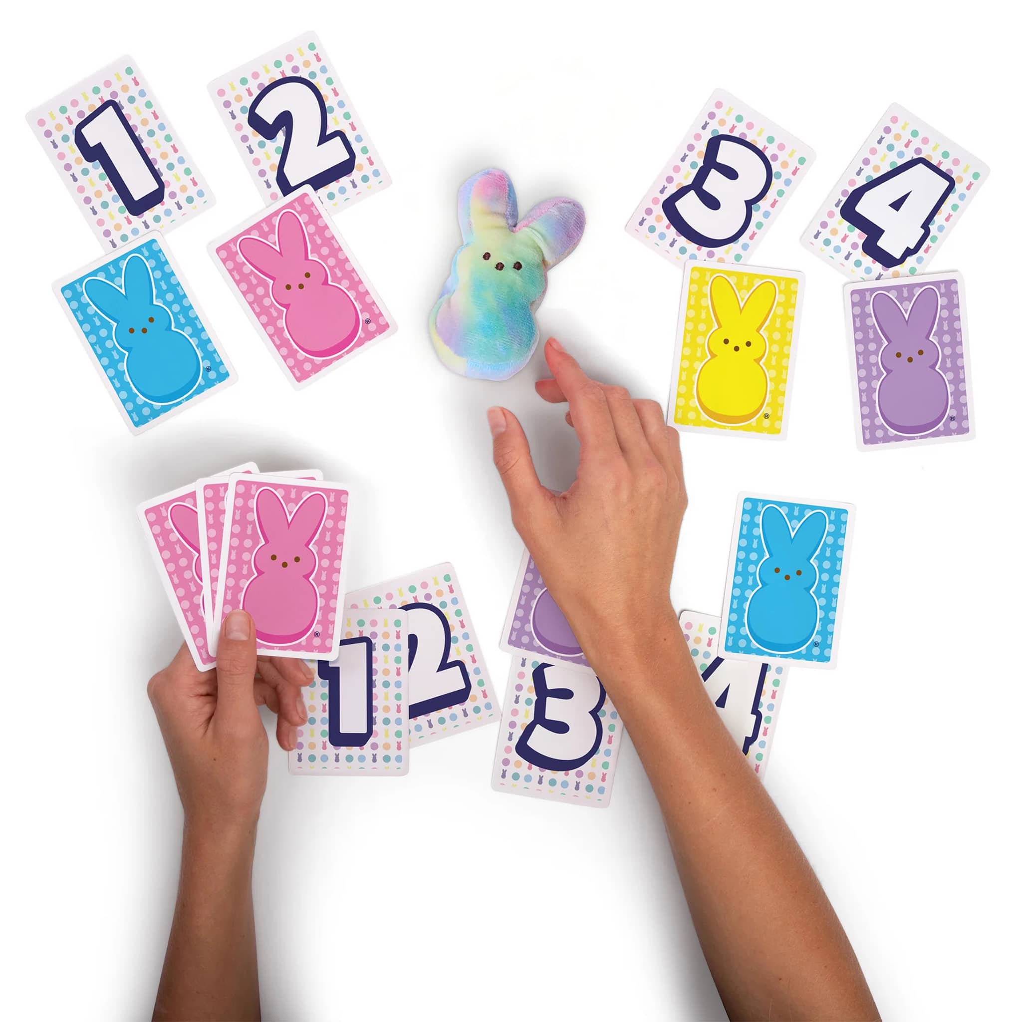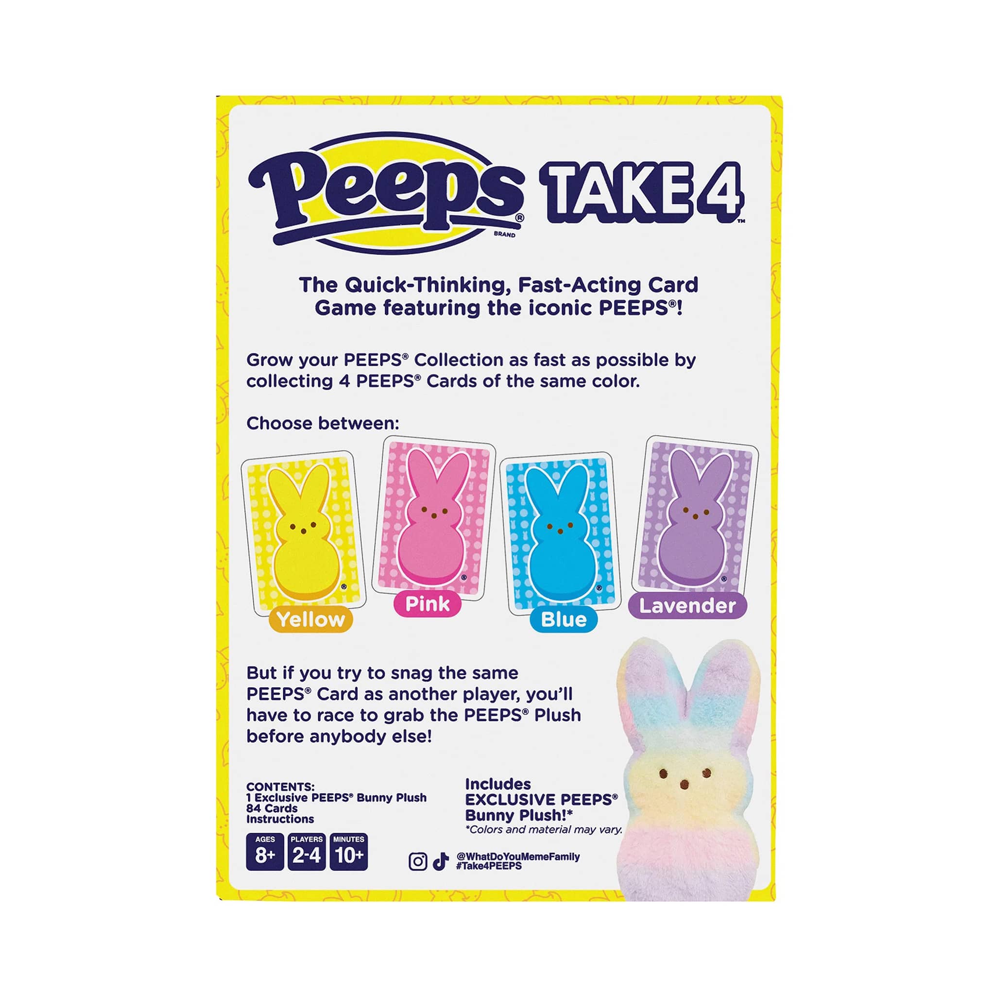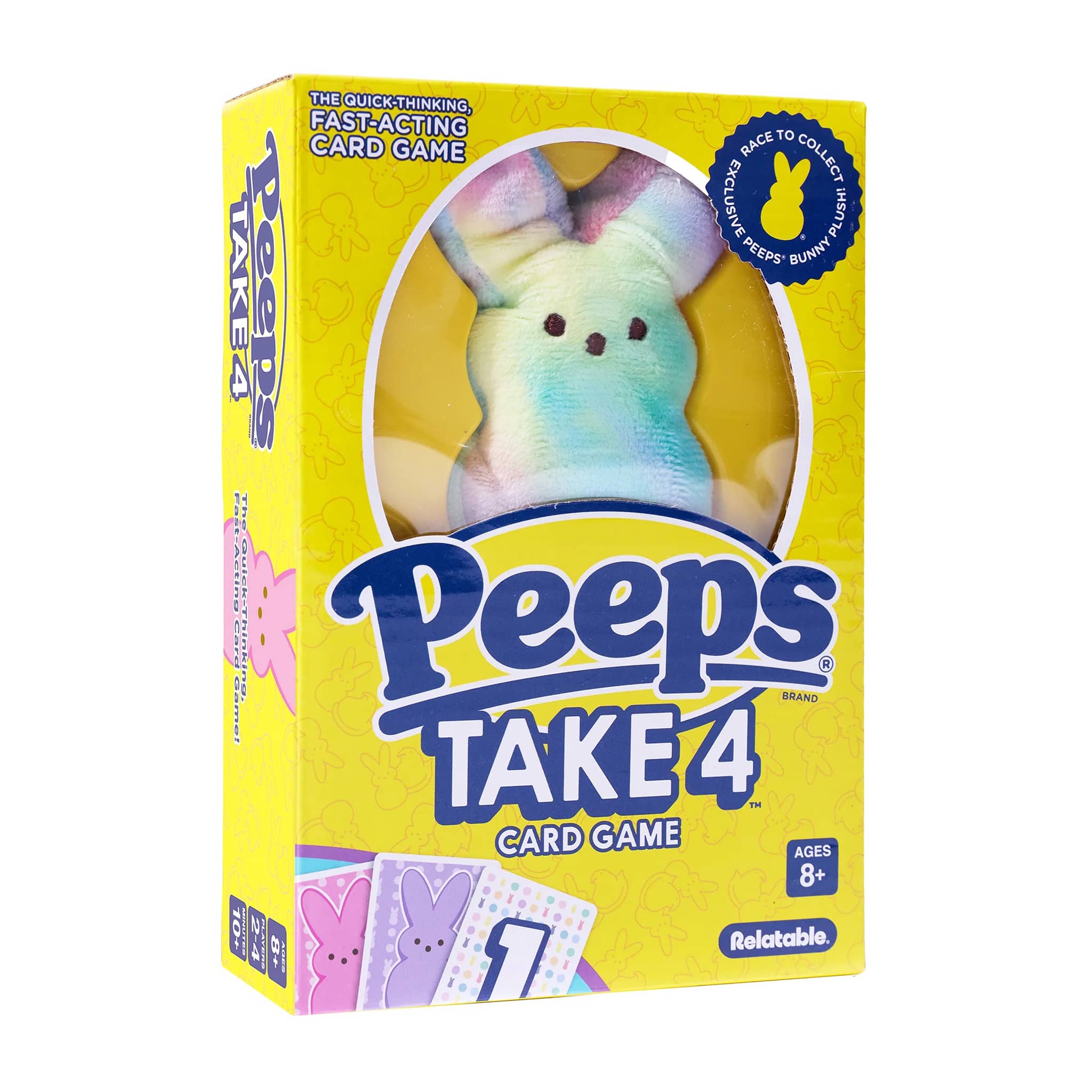 PEEPS Take 4 is a fast-paced, quick-reflex seasonal card game featuring an irresistible collectible plush. Players race to collect four matching Team Cards, and when two players want the same card, the Bunny plush becomes the tie-breaker everyone scrambles for. Designed for PEEPS fans and families, it blends nostalgia, collectibility, and interactive gameplay into one sweet, colorful package. Perfect for Easter baskets and springtime fun. For 2-4 players, estimated game play is 10+ minutes, suitable for ages 8 and up.