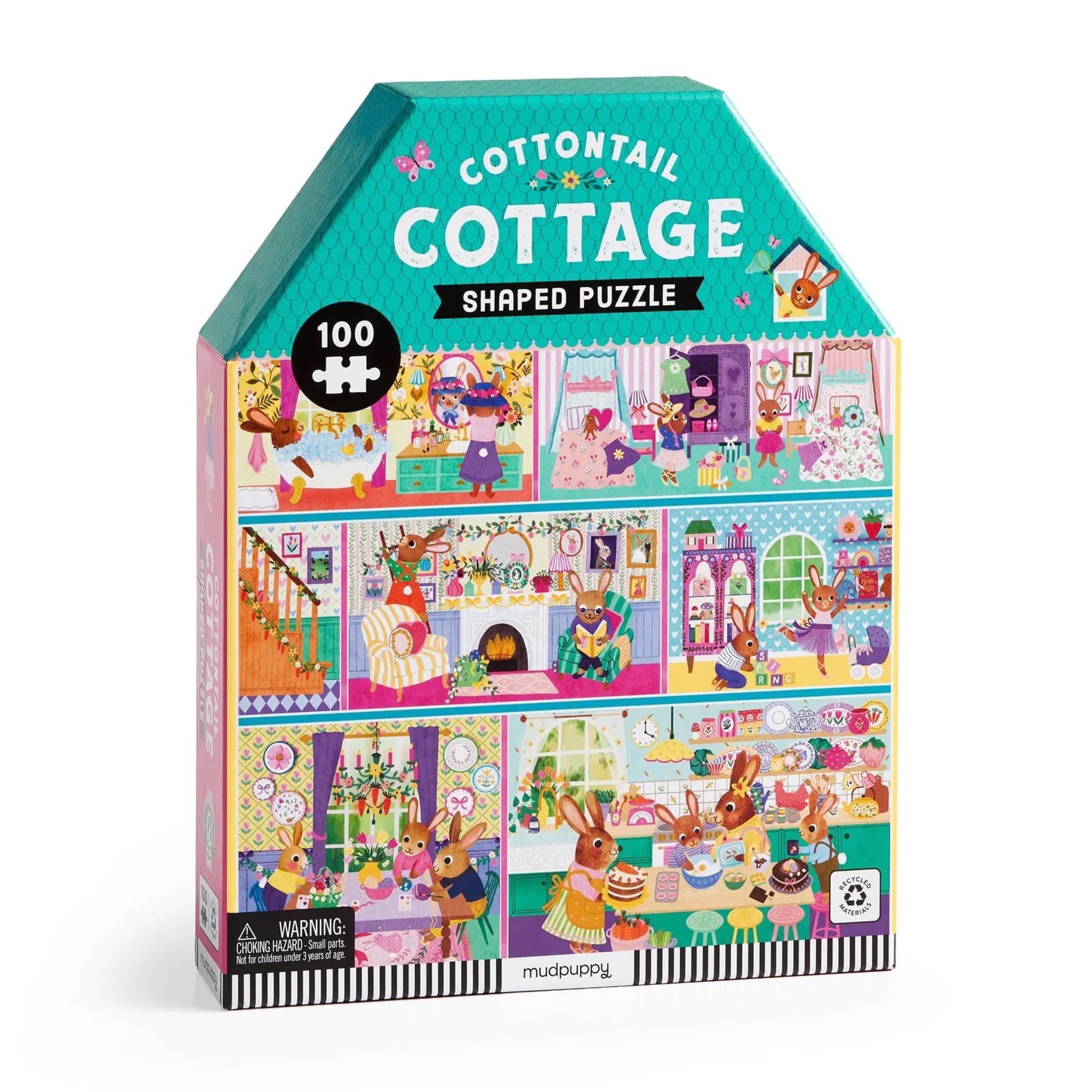 Hop into a world of whimsy with the Cottontail Cottage 100 Piece House-shaped Puzzle! This charming puzzle features adorable woodland creatures nestled in a cozy cottage, beautifully illustrated by Rebecca Jones. Perfect for young puzzlers and animal lovers alike, the unique house-shaped design adds an extra touch of magic to your puzzle-solving experience. With 100 pieces, it's ideal for building patience and creativity while enjoying quality time with family and friends. Once completed, this delightful puzzle takes the shape of a house, where an adorable bunny family celebrates the magic of spending time together.