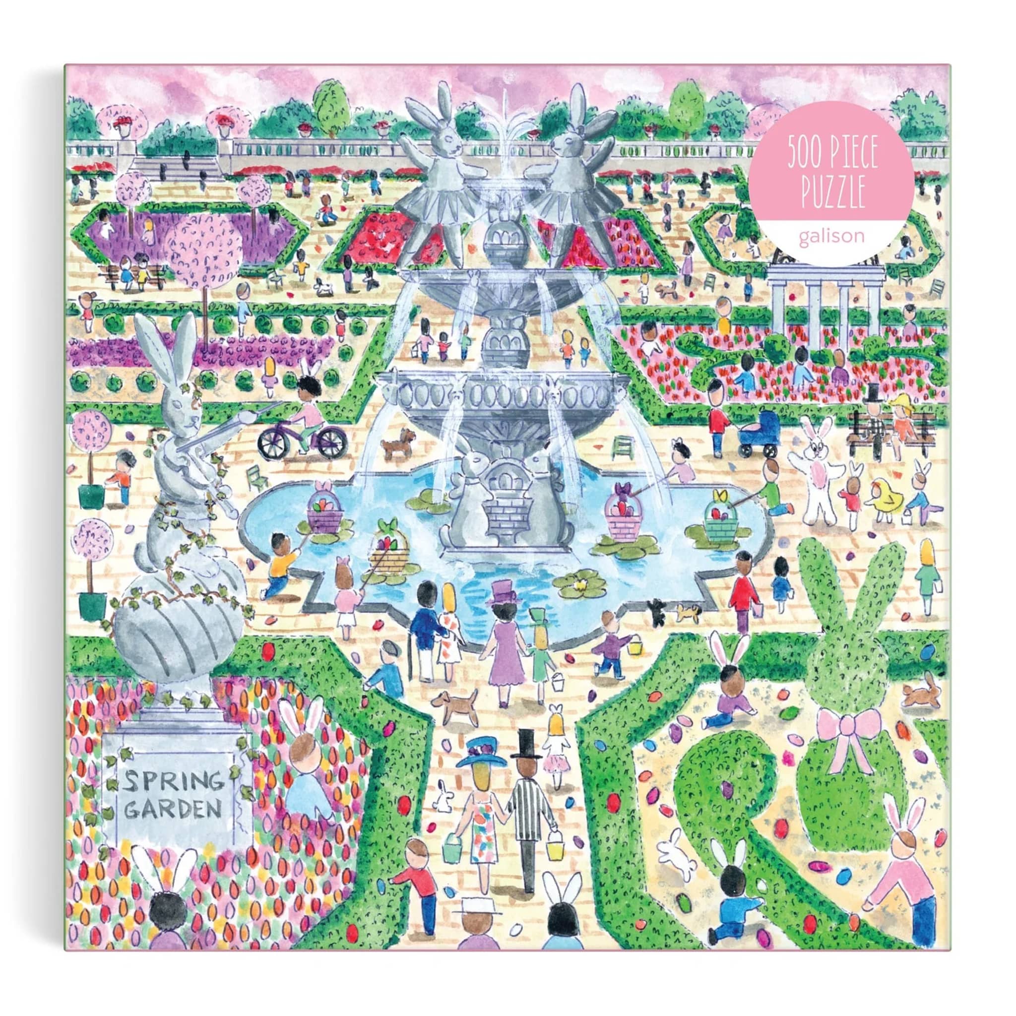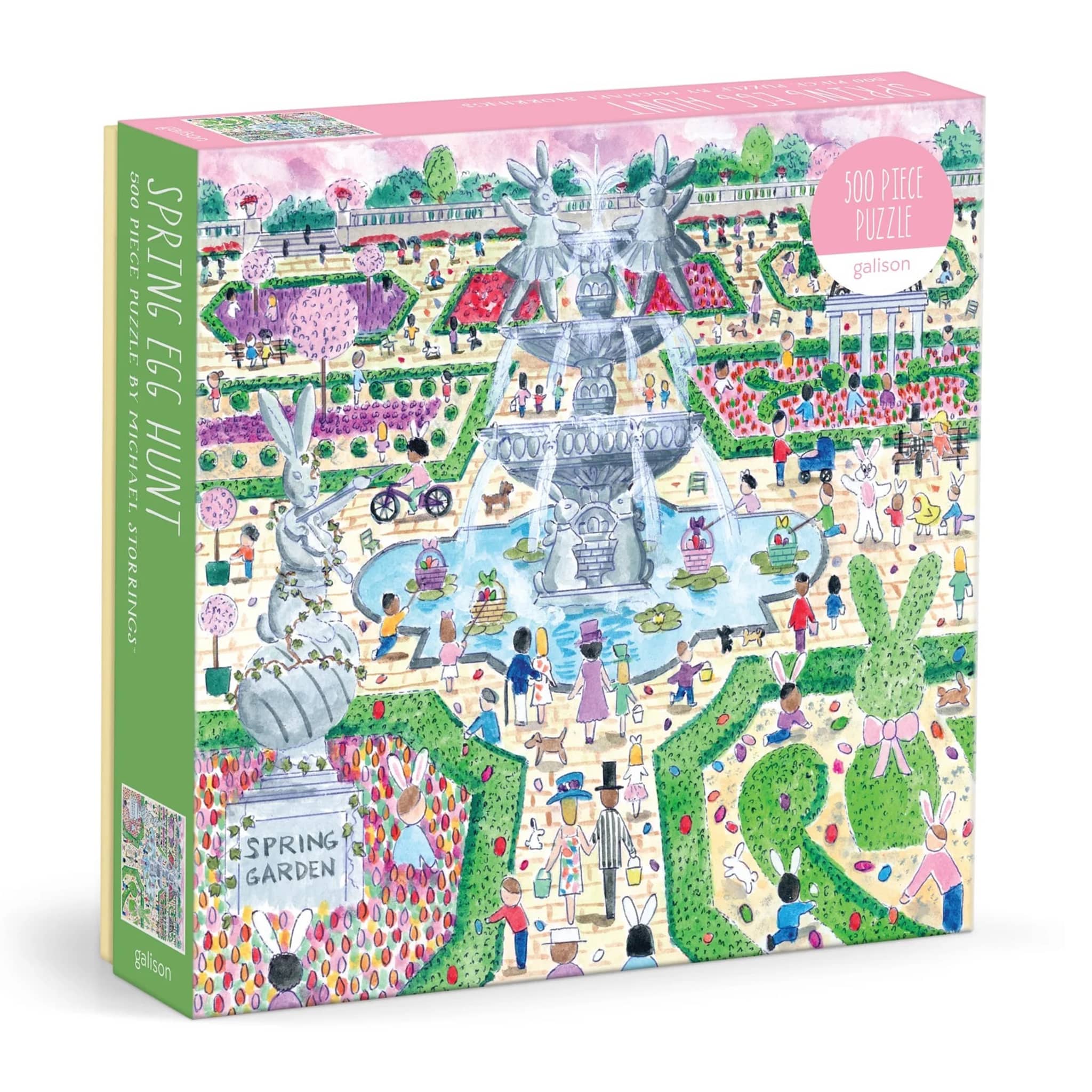 Step into a magical formal garden with this 500-piece puzzle by Michael Storrings. Inspired by the classical gardens of Europe, the illustration features meticulously manicured hedges, spring blooms, and ornamental topiaries framing a whimsical Easter celebration. A bunny fountain anchors the scene, surrounded by graceful statuary and hidden eggs throughout the composition. Storrings captures the elegance of traditional garden design infused with festive charm, creating an engaging puzzle that rewards careful observation and celebrates the beauty of spring.