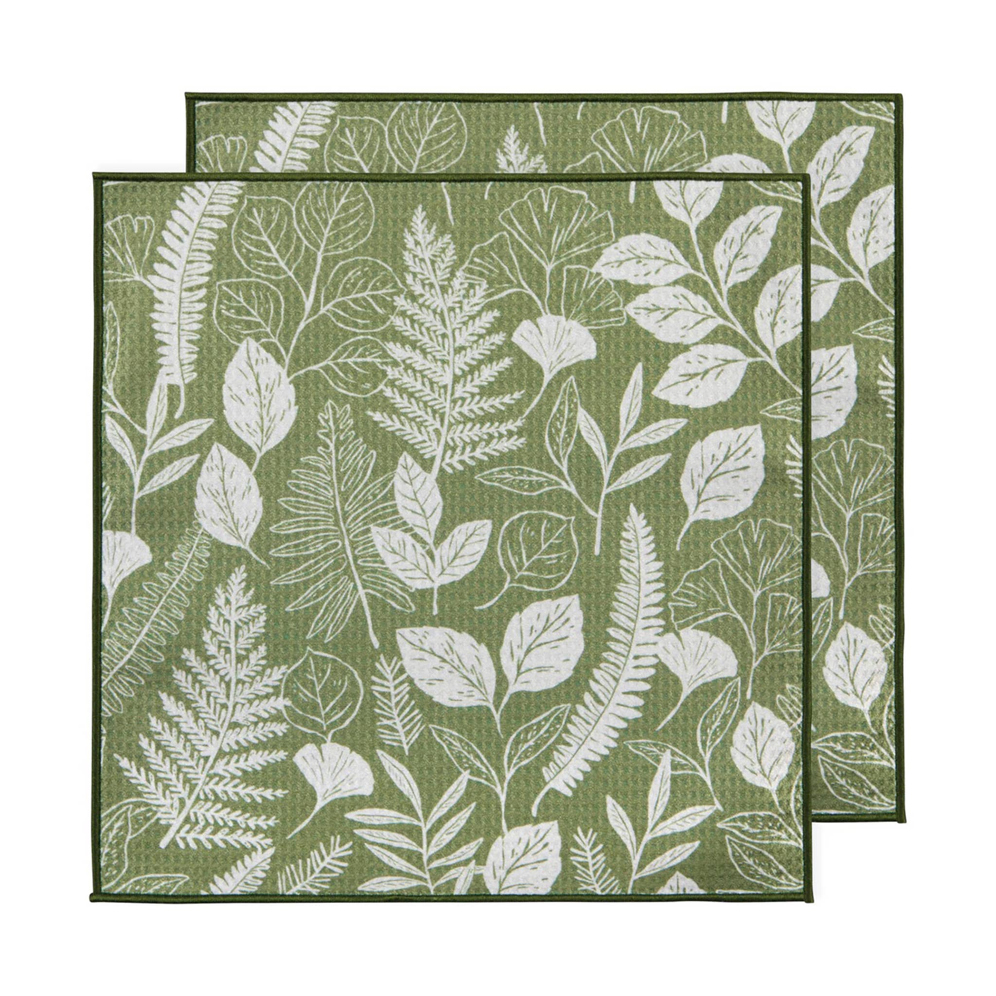 Soft, absorbent microfiber makes these Renew Fern & Frond dishcloths multi-purpose additions to the kitchen. Dishes and counters get a lint-free and streak-free clean-up with these quick-drying wonders. A lush ode to nature, the Fern & Frond print features layered leafy botanicals in earthy green and soft cream. A combination of organic elegance with modern color blocking for year-round beauty. Dishcloth dimensions are 12 x 12 inches and they are made from 80% recycled polyester and 20% polyamide. Care Instructions: Machine wash warm, tumble dry on low setting.