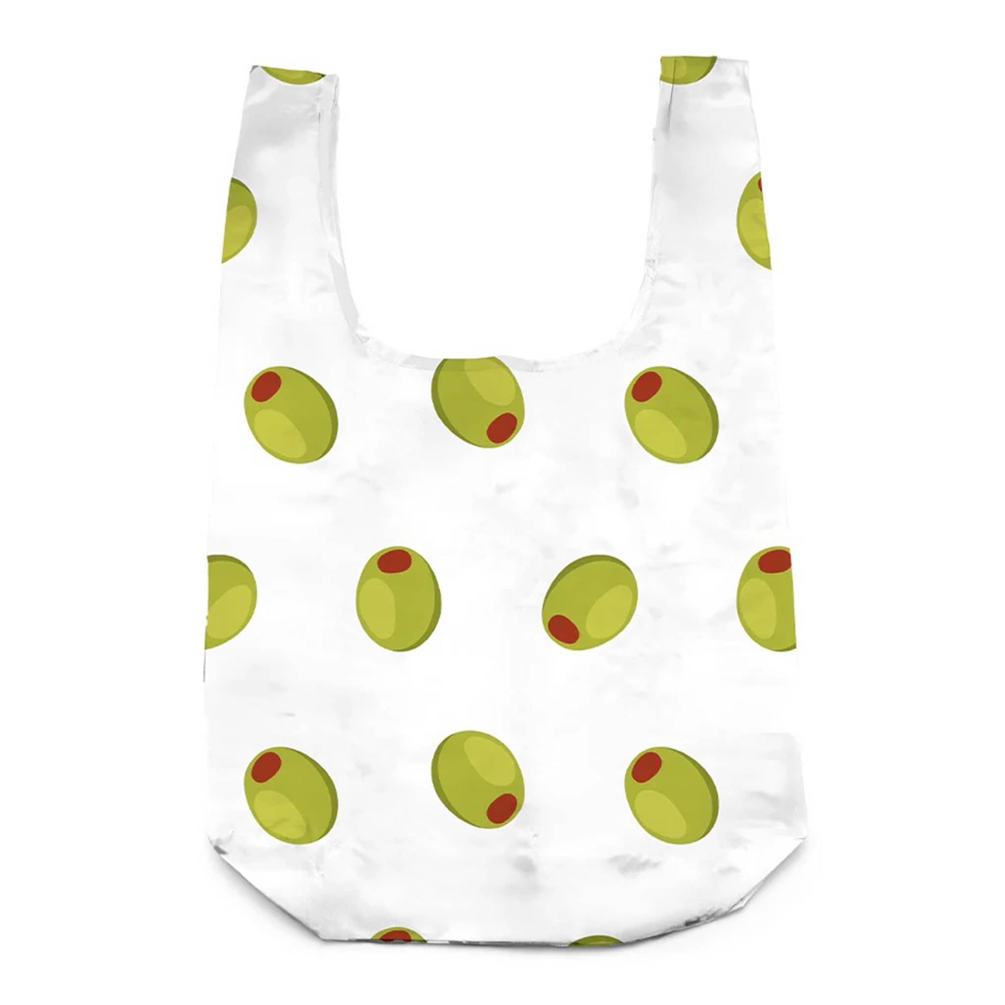 Have the best of both worlds! This Olive 2-in-1 Bag Charm has a reusable shopper bag stored inside! The charm is shaped like a green olive with pimento and the included tote is white with a repeating olive print that looks like the charm. Connect the charm to any bag, key chain, or accessory with the attached key ring. The zipper closure on the charm can be used to store the tote or other personal items inside. The reusable polyester shopper tote measures 14 x 20 x 6 inches and can hold up to 50 lbs. The charm measures 4 x 1.5 x 3 inches.