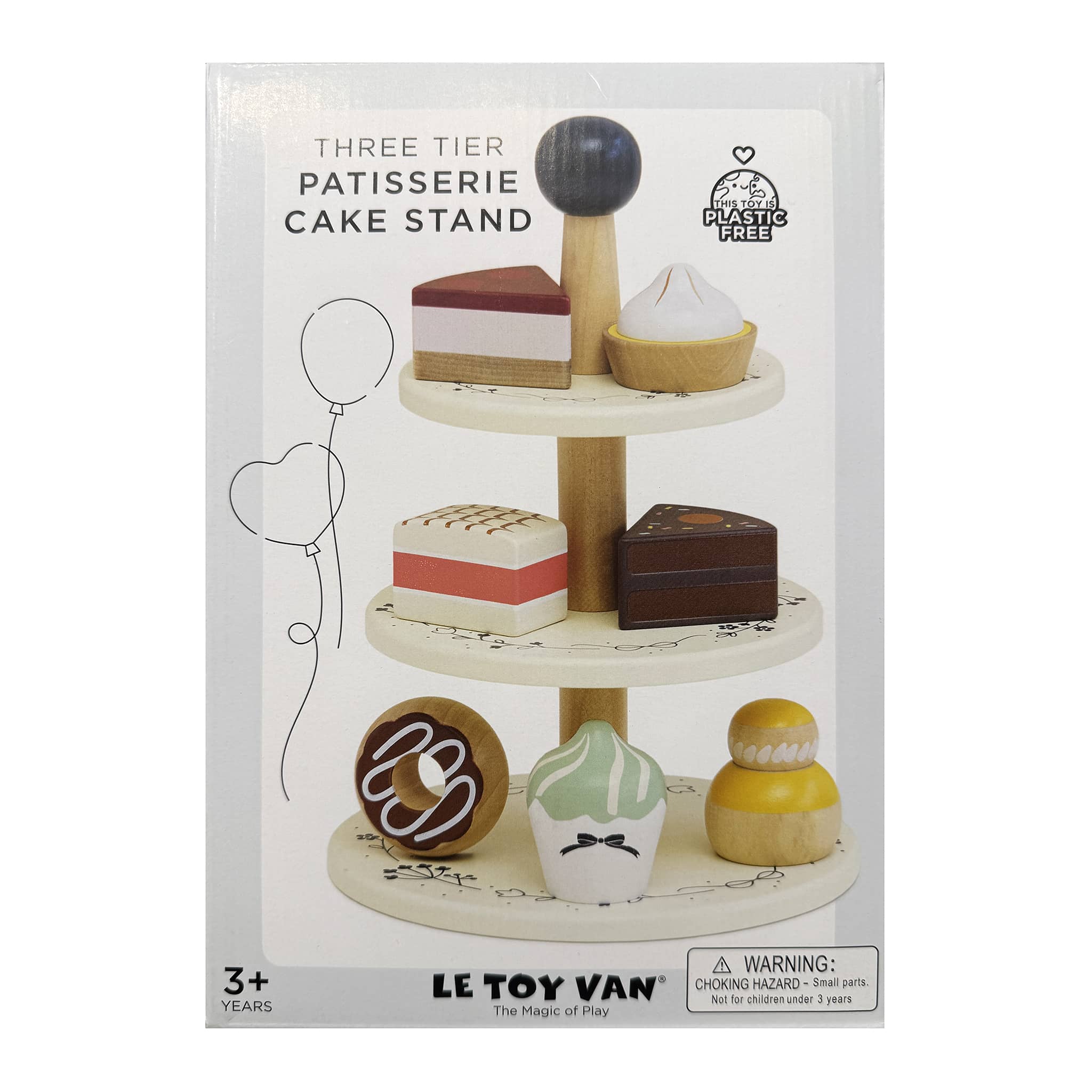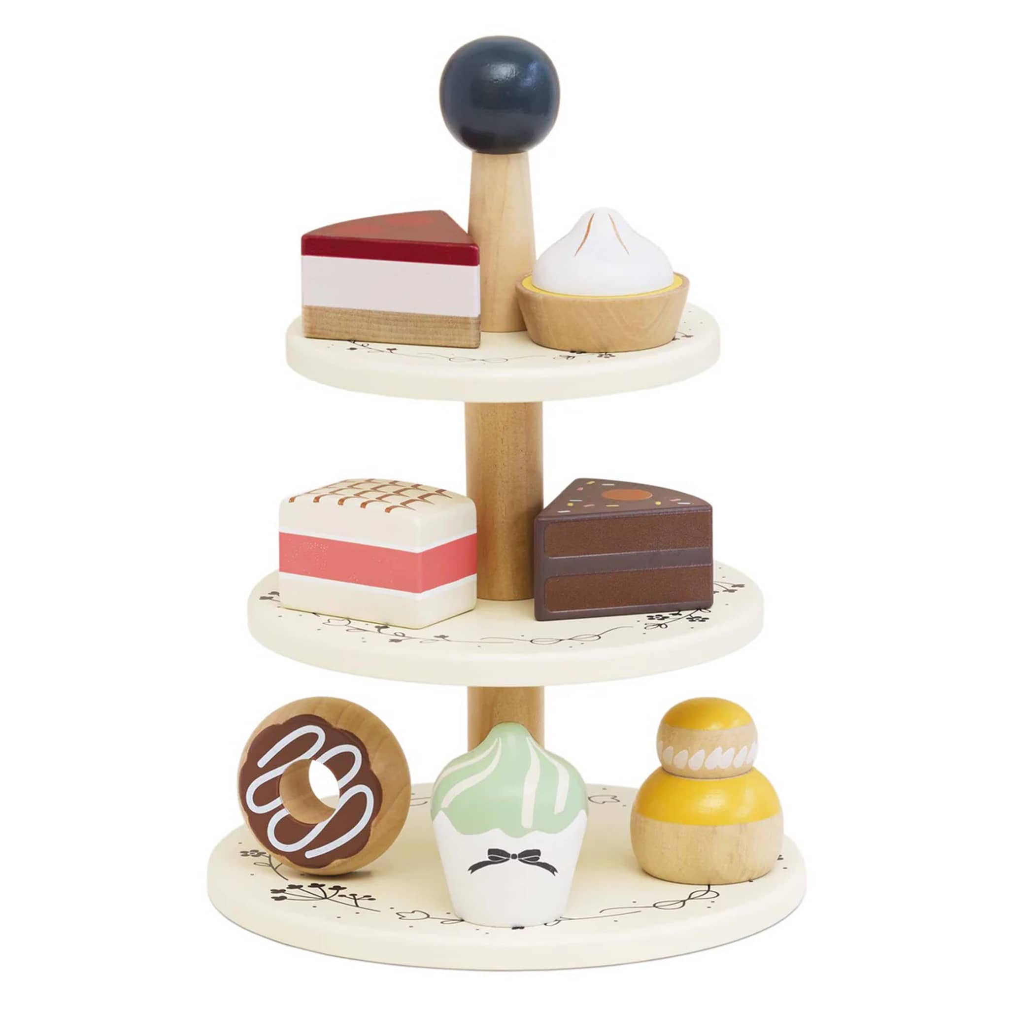 This lovely Three Tier Wooden Cake Stand comes with a selection of 7 delectably sweet treats, perfect for any occasion! Each tier of this beautifully adorned cake stand features a different mouth-watering delight. Let taste buds dance as kids pretend to indulge in a lemon and cream choux bun, a zesty lemon meringue tart, a chocolate doughnut, a decadent three-layered cake, a whimsical swirl cupcake, a raspberry cream cake, and a rich chocolate cake. This cake stand set is not only visually stunning, it also encourages social and imaginative play along with role-playing. Box packaging measures 10 x 7 x 7 inches. Suitable for ages 3 and up.