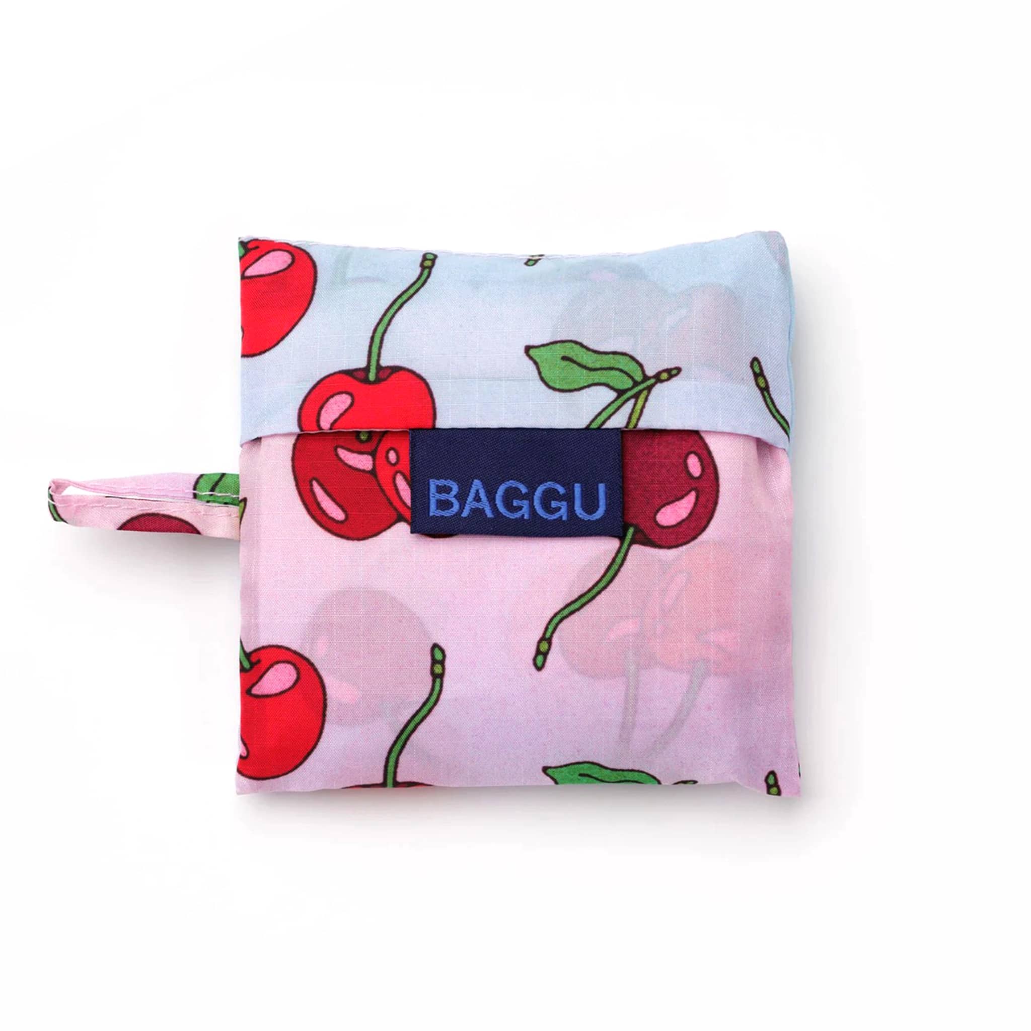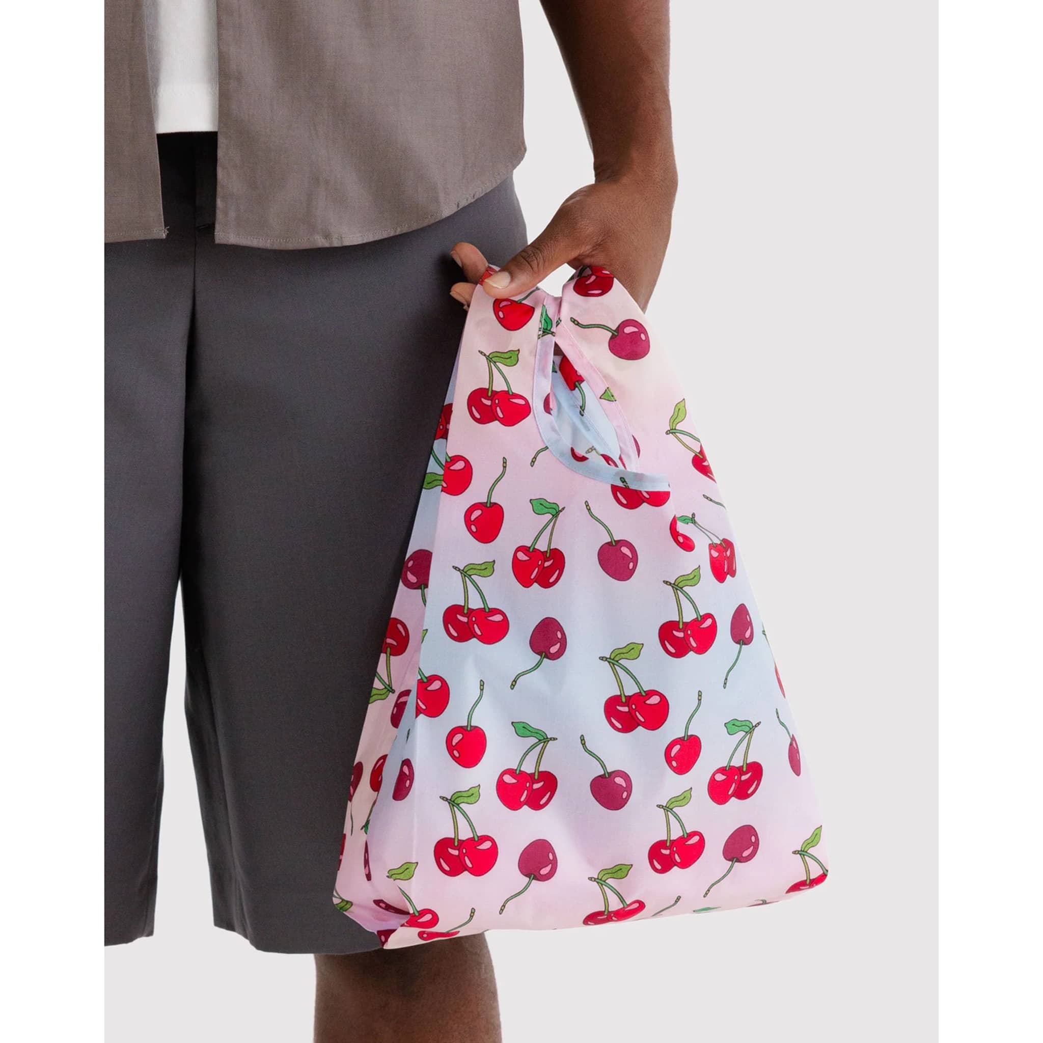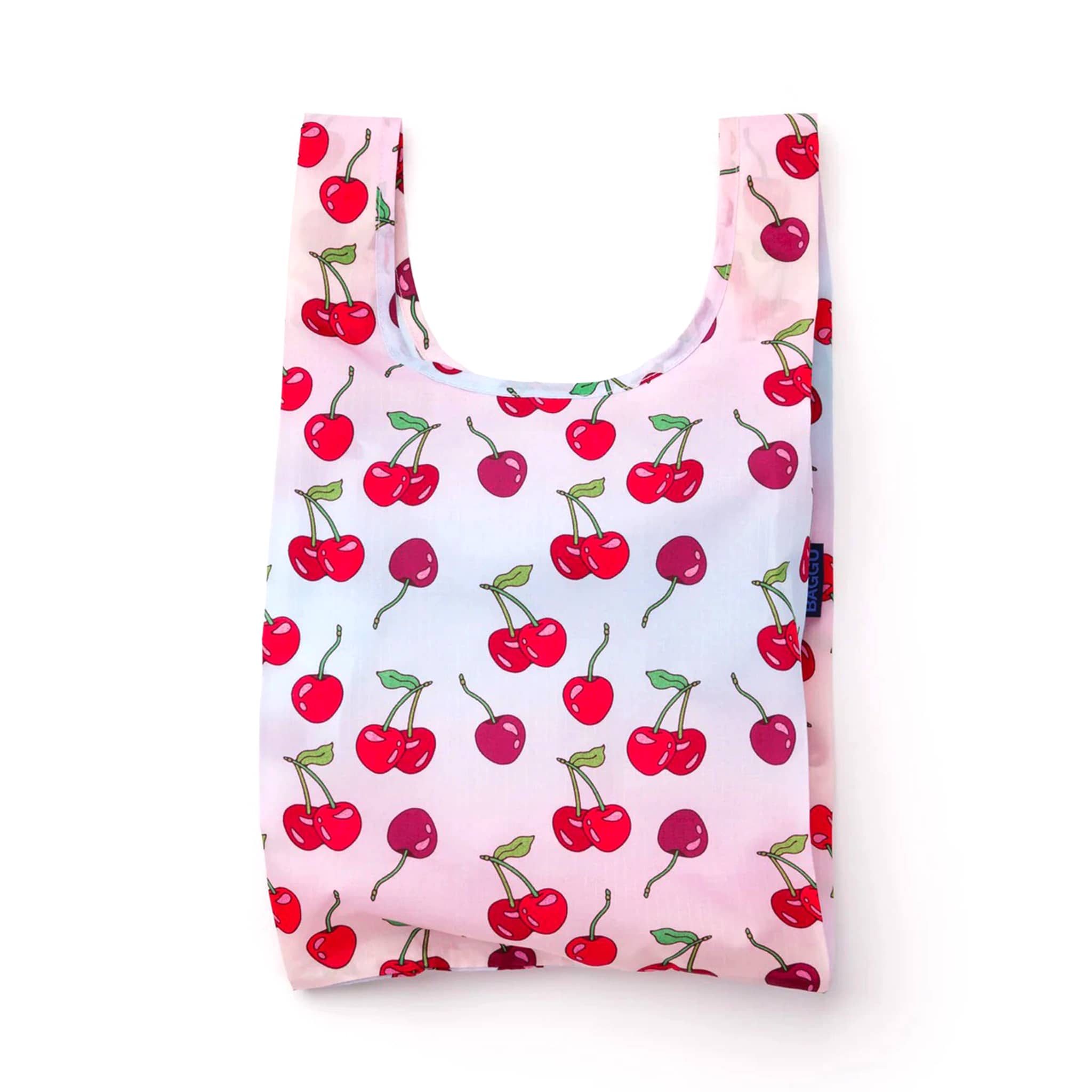 A smaller version of BAGGU's original reusable shopping bag. Perfect for your lunch, a six-pack, extra shoes, or a trip to the corner store. This tote features the Cherries print with juicy red cherries and green stems on a pink and blue ombre backdrop. Built-in straps for hand carrying allow you to hold up to 40 lbs comfortably in your hand. 18 x 10 x 4 inch bag folds into a flat 4 x 4 inch pouch.