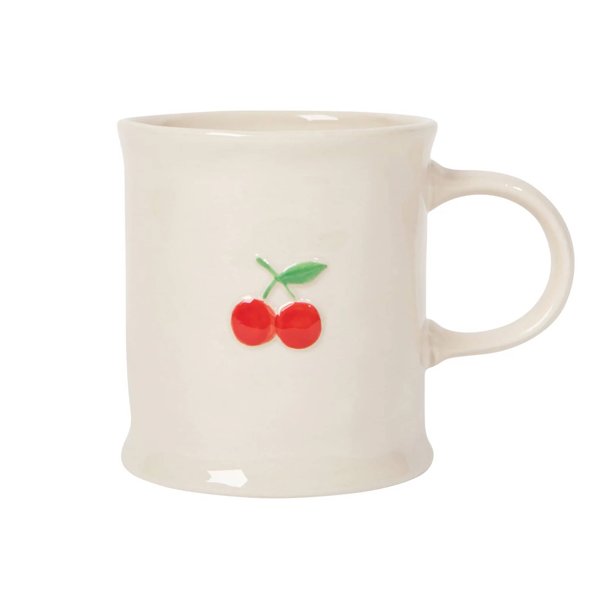 Sip in sweet style with this glossy white stoneware mug, featuring two charming cherries on a green stem embossed on the front. Crafted from durable stoneware with a smooth, shiny finish, this mug adds a playful yet timeless touch to your morning coffee or afternoon tea. The raised cherry design brings subtle texture and visual interest, while the clean white glaze keeps it feeling fresh and modern. Perfect for everyday use or as a thoughtful gift, this cherry-embossed mug is a delightful way to brighten any beverage break. Made from 100% stoneware, this 16-ounce mug is dishwasher and microwave-safe. Measures 3.75 inches in diameter x 4 inches tall.