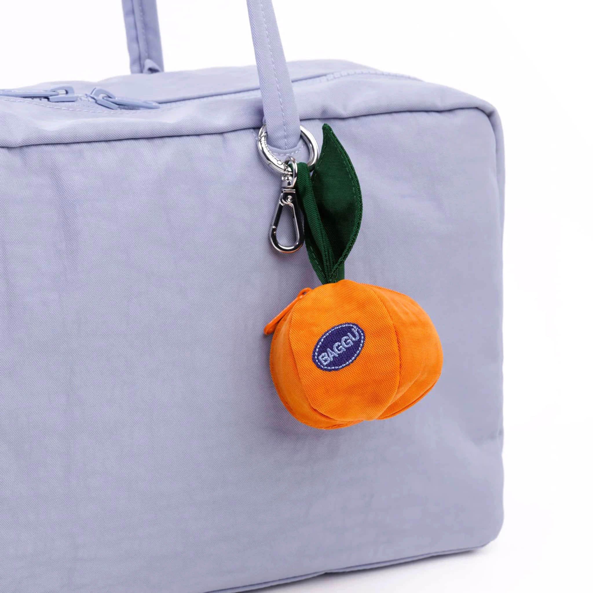 A juicy Mandarin Charm from BAGGU to accessorize your larger bag while keeping small items like earbuds or lip balm close at hand. Made from recycled heavyweight nylon, it features a zip closure and a metal key ring with clip. This charm has a cutie mandarin-shaped design in orange with a green "stem" and embroidered branding. Attaches to any handbag or tote. Charm measures 4.2 x 3 x 3.7 inches. Remove keyring to machine wash and line dry.