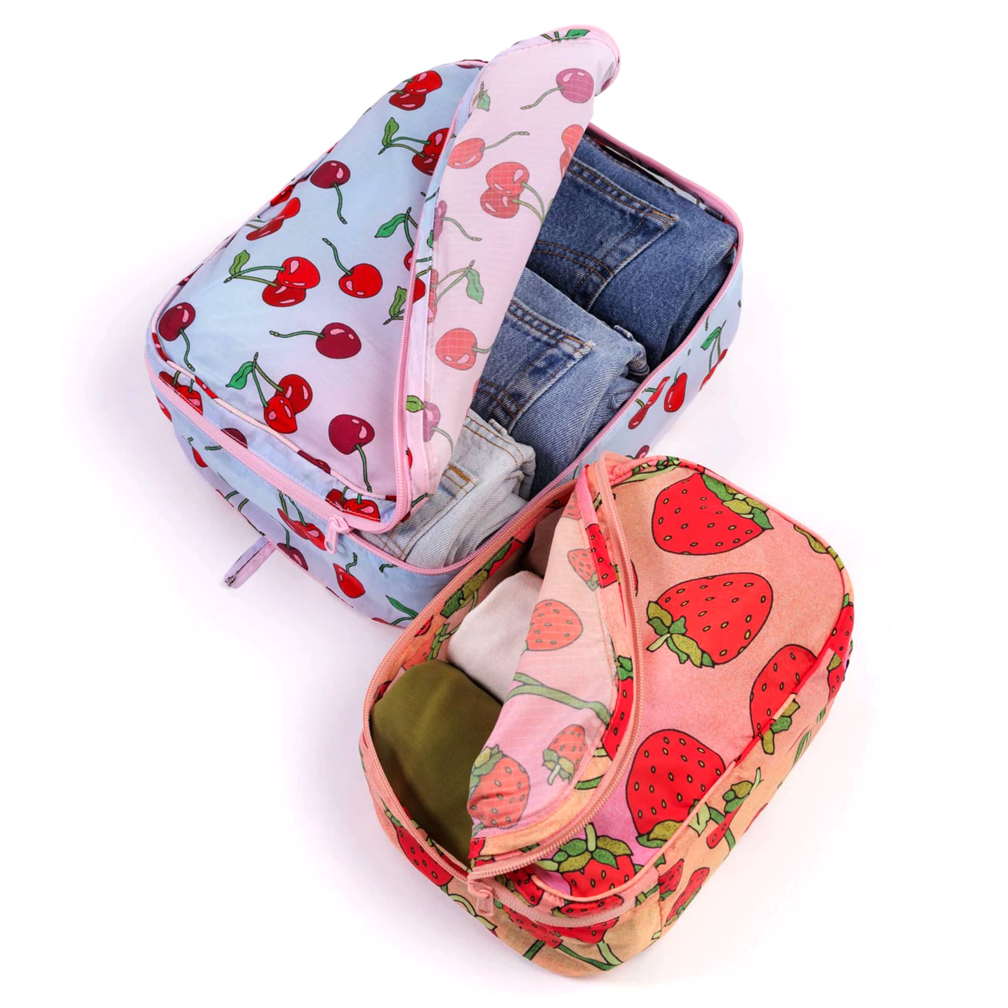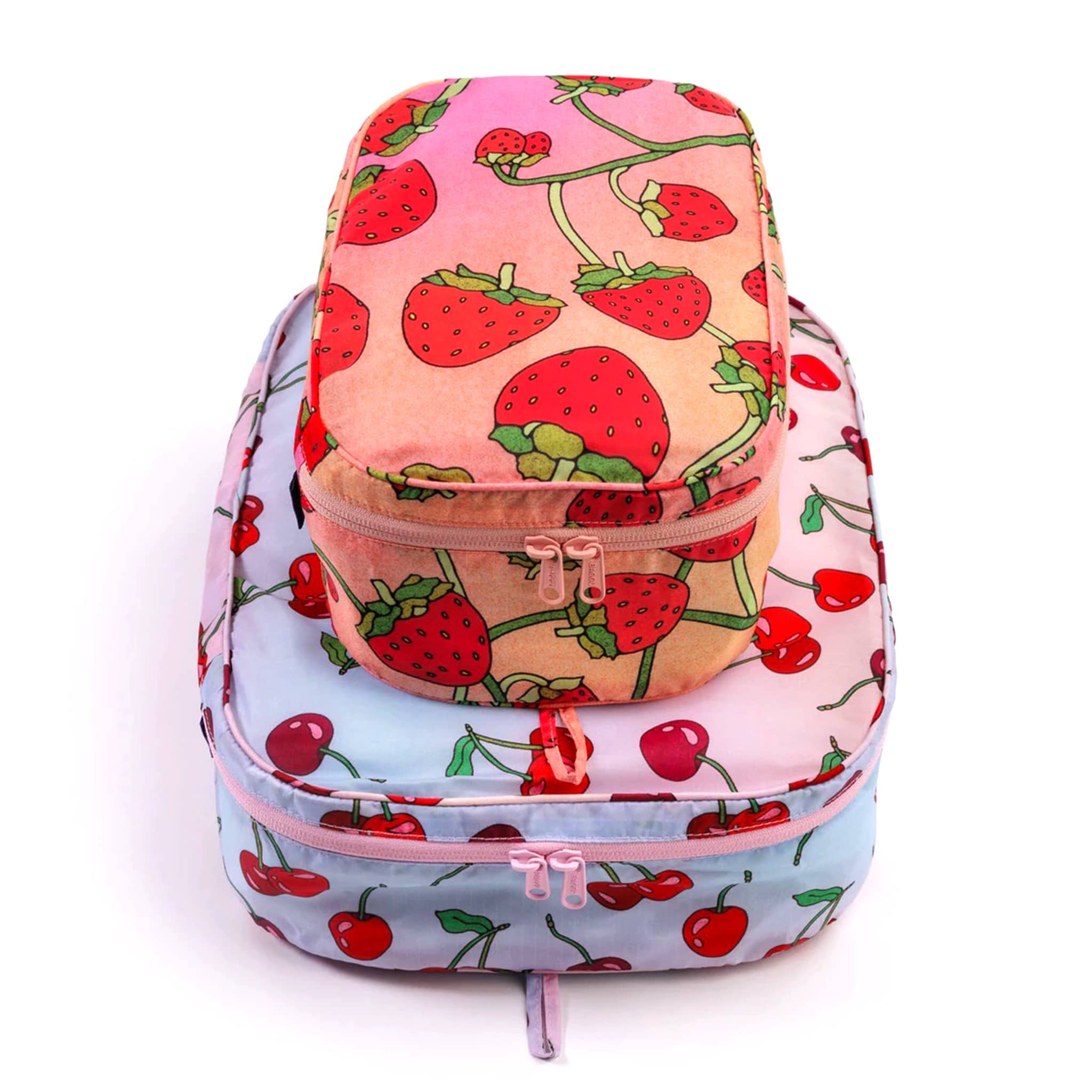 The large bag features the Cherries print and measures 10 x 13 x 4 inches. The small bag features the Strawberry Blossom print and measures 6.5 x 10 x 4 inches. Machine-washable, made with recycled ripstop polyester (100% recycled polyester filament yarn produced from pre-consumer waste). Packaging is made from FSC-certified 100% recycled paper stock with non-plastic, eco-friendly coatings that are fully recyclable.