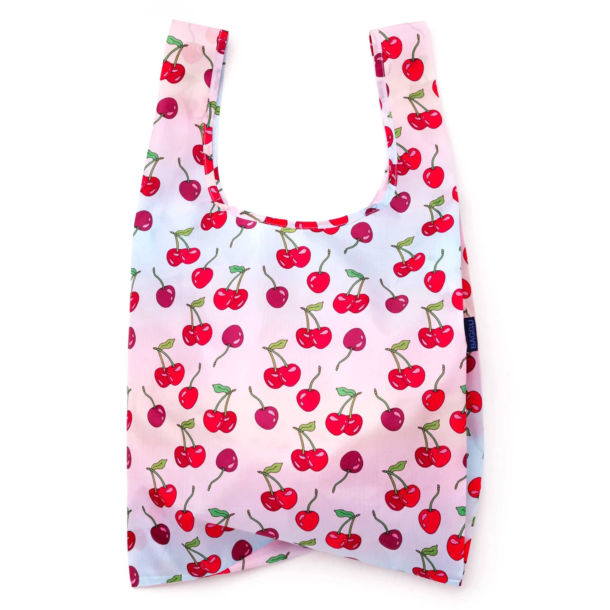 This best-selling eco-friendly reusable bag from BAGGU is not just for the grocery store; it can go everywhere and haul almost anything! The Cherries print features bright red cherries with green stems on a pink and blue ombre backdrop. The built-in straps can be used as a shoulder bag or carried in your hand. Holds the equivalent of two to three single-use plastic grocery bags worth of stuff, up to 40 pounds!