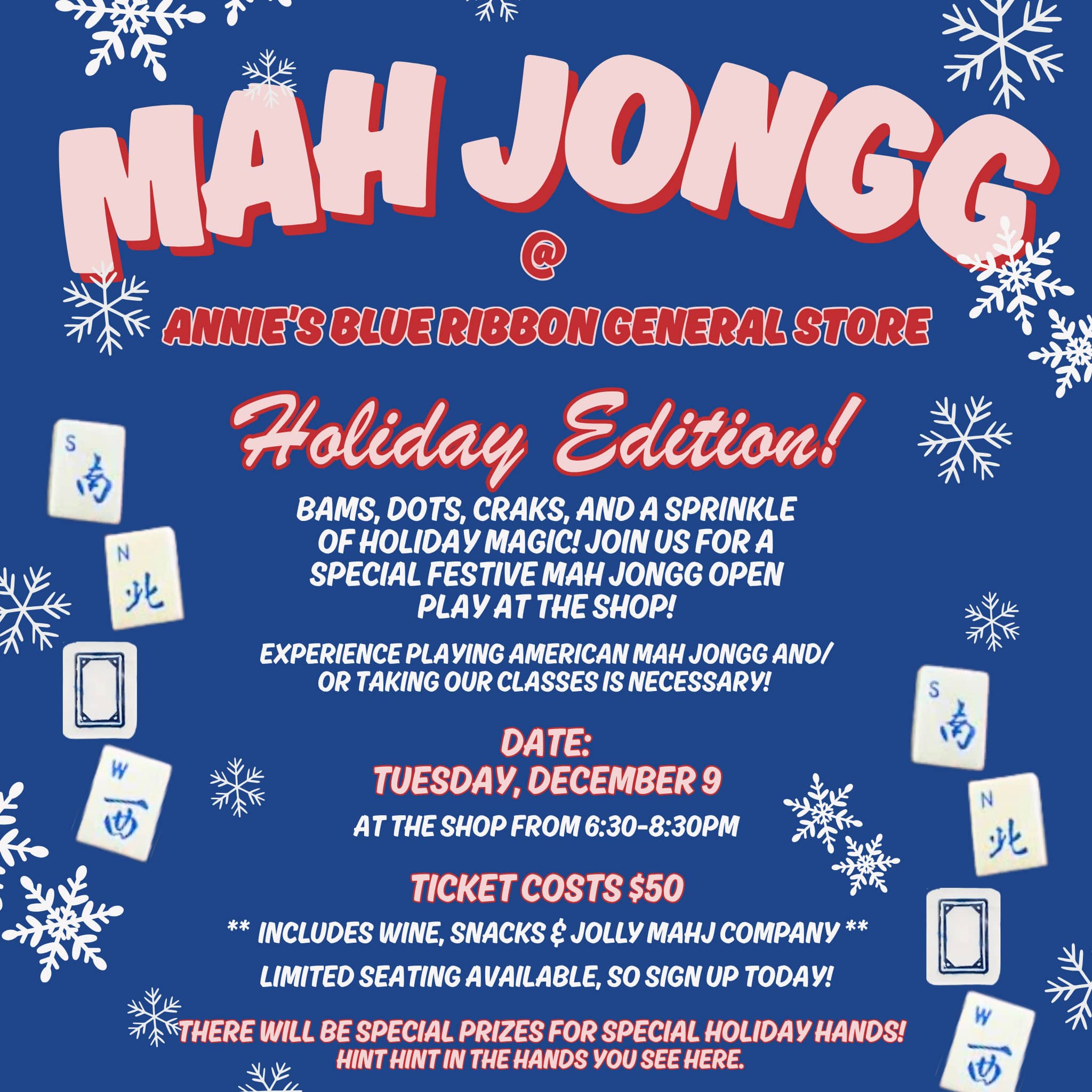 Join us for a special Holiday Mah Jongg Open Play event at Annie's on Tuesday, December 9th, 2025, from 6:30 to 8:30 pm (arrive at 6:15 for setup)!