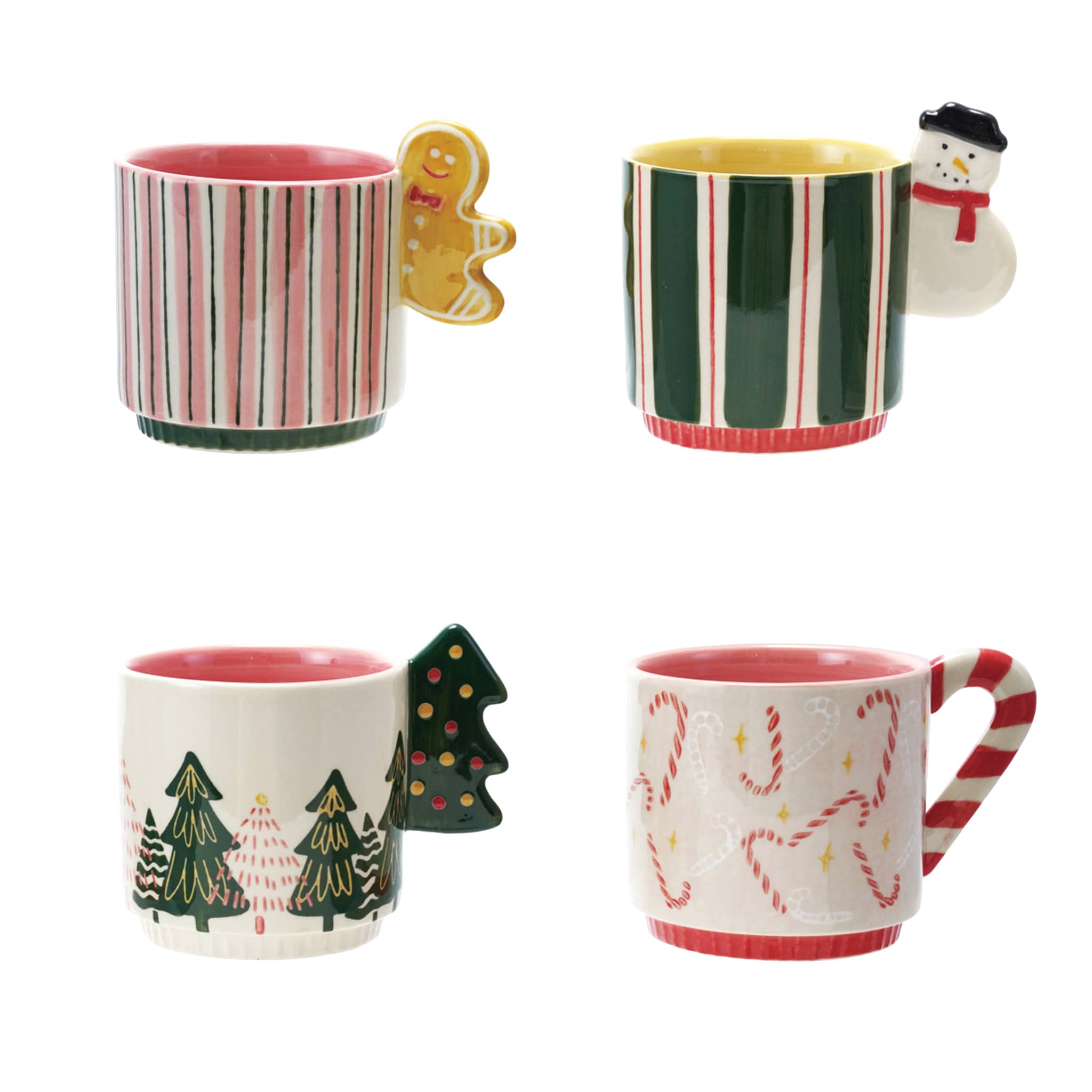 Make your winter mornings even brighter with this hand-painted Stoneware Holiday Mug! Each mug features a different pattern, with a holiday icon-shaped handle. Mugs measure 3.75 inches in diameter x 4.25 inches tall and hold 16 ounces of your favorite hot beverage. Available in 4 styles: gingerbread man, snowman, tree, or candy cane. Add some hot cocoa mix for a great Christmas gift!