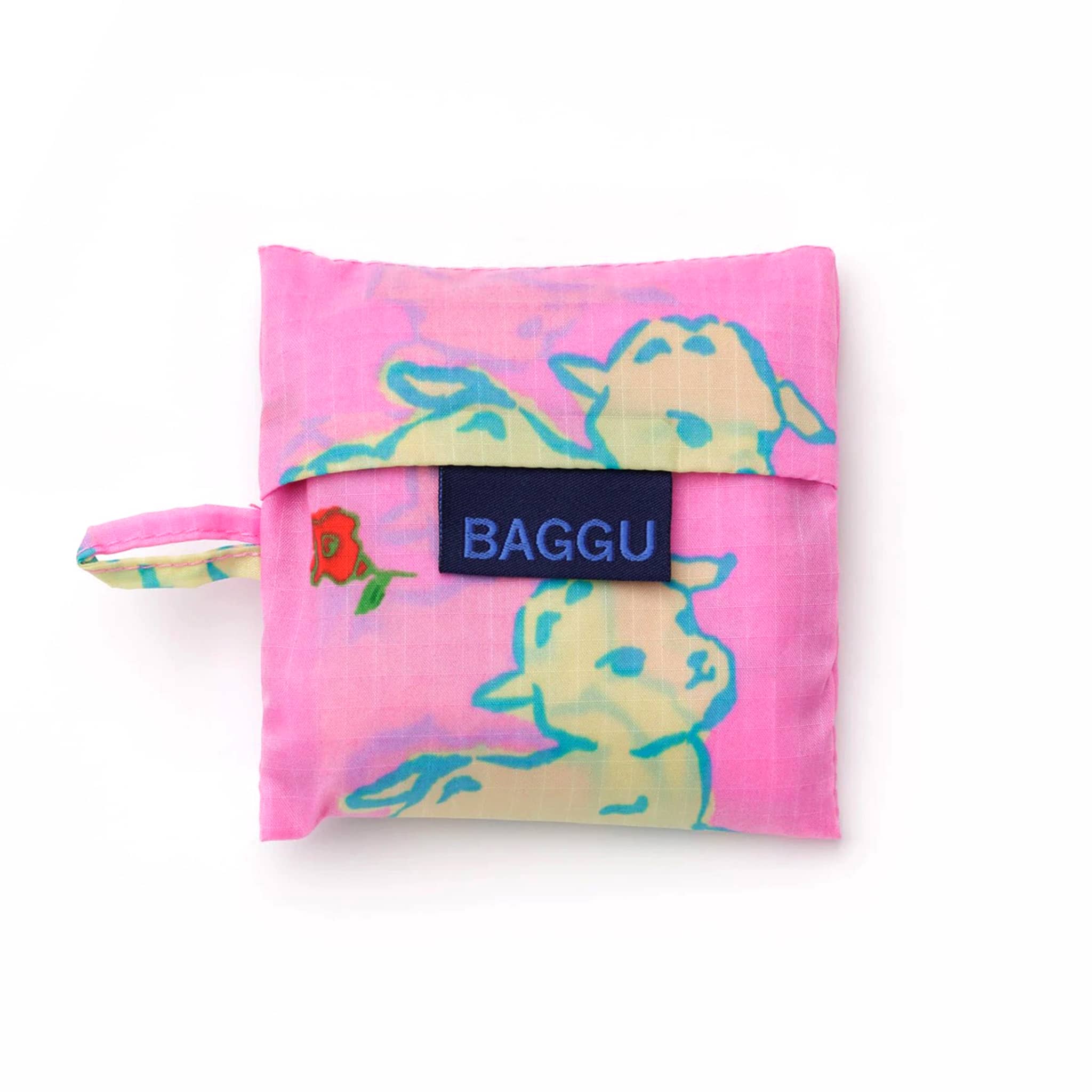 A smaller version of BAGGU's original reusable shopping bag. Perfect for your lunch, a six-pack, extra shoes, or a trip to the corner store. This tote features the Lambs print with adorable little lambs jumping on a pink backdrop. Built-in straps for hand carrying allow you to hold up to 50 lbs comfortably in your hand. 18 x 10 x 4 inch bag folds into a flat 4 x 4 inch pouch.
