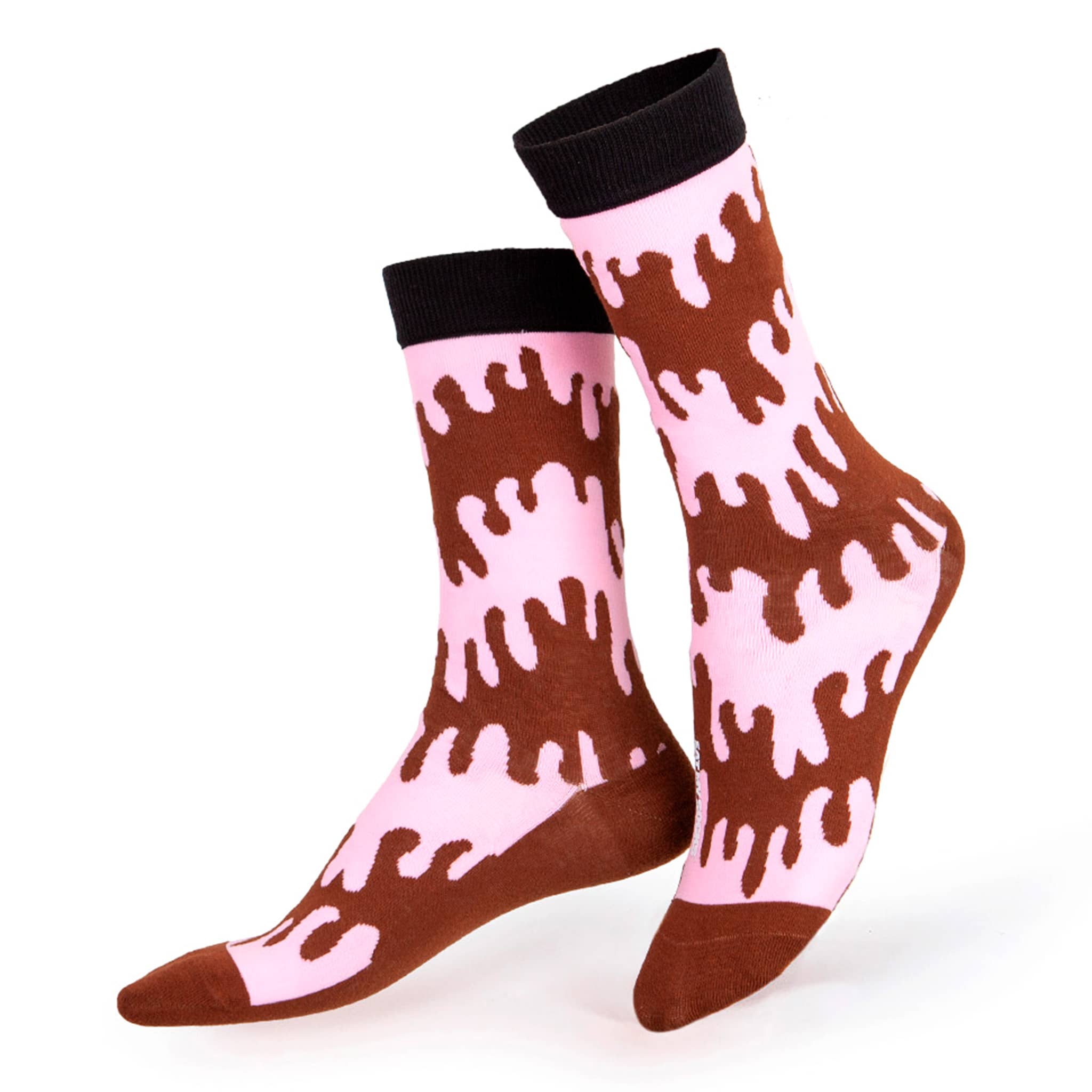 The pair of pink and brown patterned unisex socks with black top trim comes packaged in a glass jar. These fun and comfy crew socks are made from a blend of 72.8% cotton, 25.6% polyester, and 1.6% elastane. One size fits most, machine washable, fit US women sizes 5 to 11, men sizes 4 to 10.