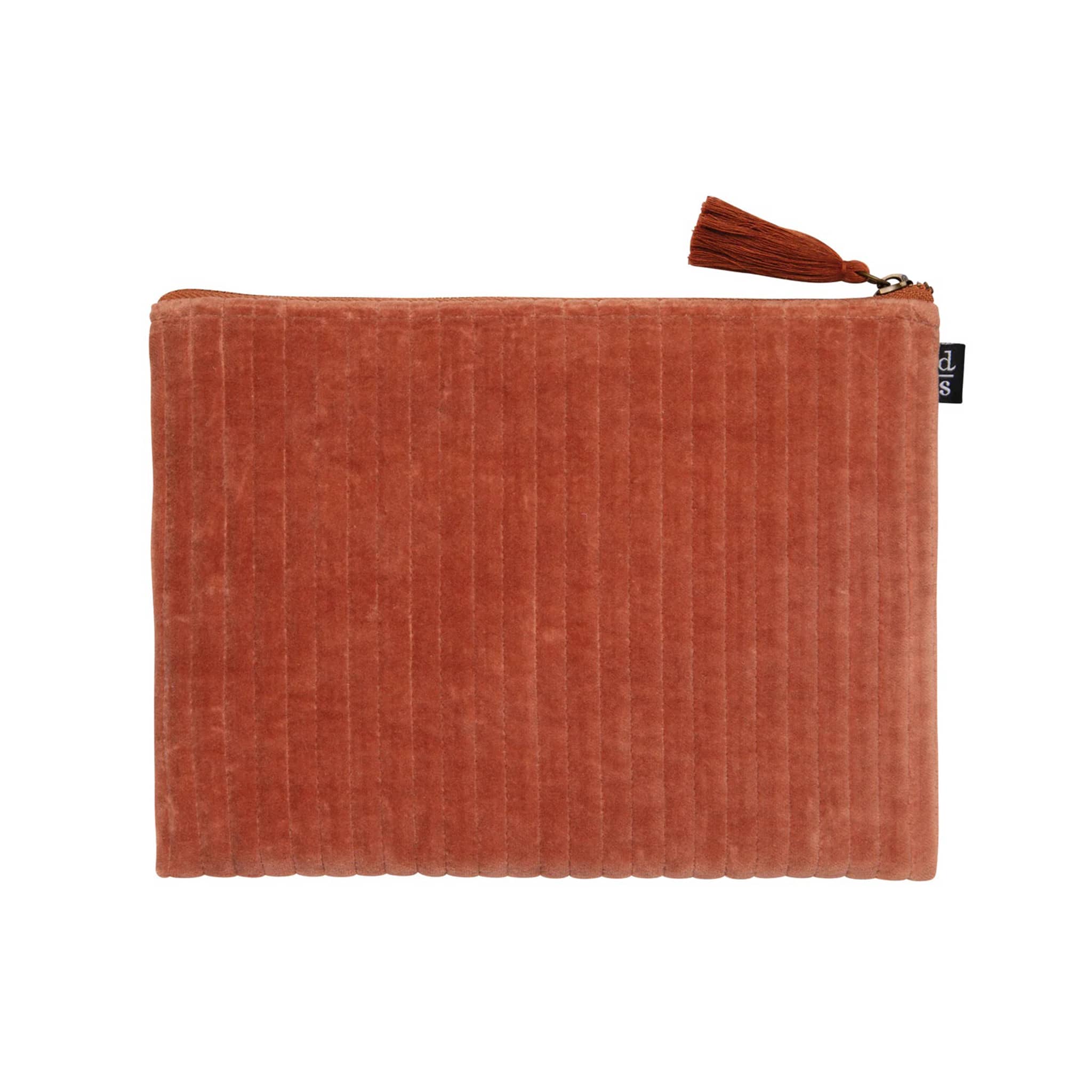 Meet your new favorite little sidekick! This Copper Quilted Velvet Flat Zip Pouch is equal parts glam and practical. With its rich, touch-me velvet texture and distinctive stitched design, it’s cute enough to carry as a clutch and clever enough to keep your cosmetics, cords, or everyday essentials neatly tucked away. The flat silhouette slips easily into a tote or handbag, while the zip-top closure keeps everything secure. Whether you’re organizing on the go or stepping out light and stylish, this versatile pouch brings a warm pop of shine and playful polish wherever it goes. Made with 100% cotton velvet with a 100% cotton interior lining. Spot clean only. Pouch measures 7 x 9.75 inches.