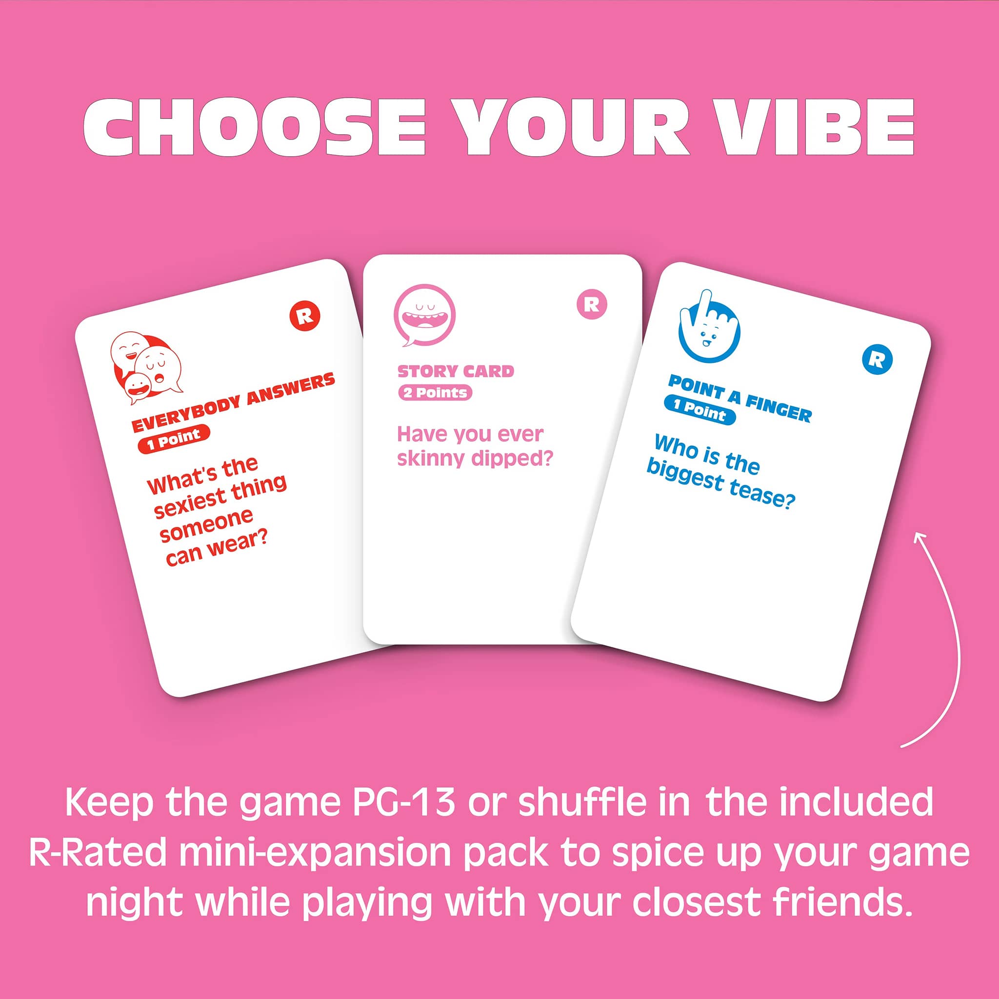 Keep it clean or make it spicy with the included R-Rated mini-expansion pack. Clearly marked R-Rated cards let you adjust to your group, and every player gets a Nope Card to skip any topic they’re not comfortable with. Everyone stays engaged and having fun. Perfect as a drinking game, icebreaker game, or casual conversation game for adult game nights, happy hours, bachelorette parties, or family gatherings.
