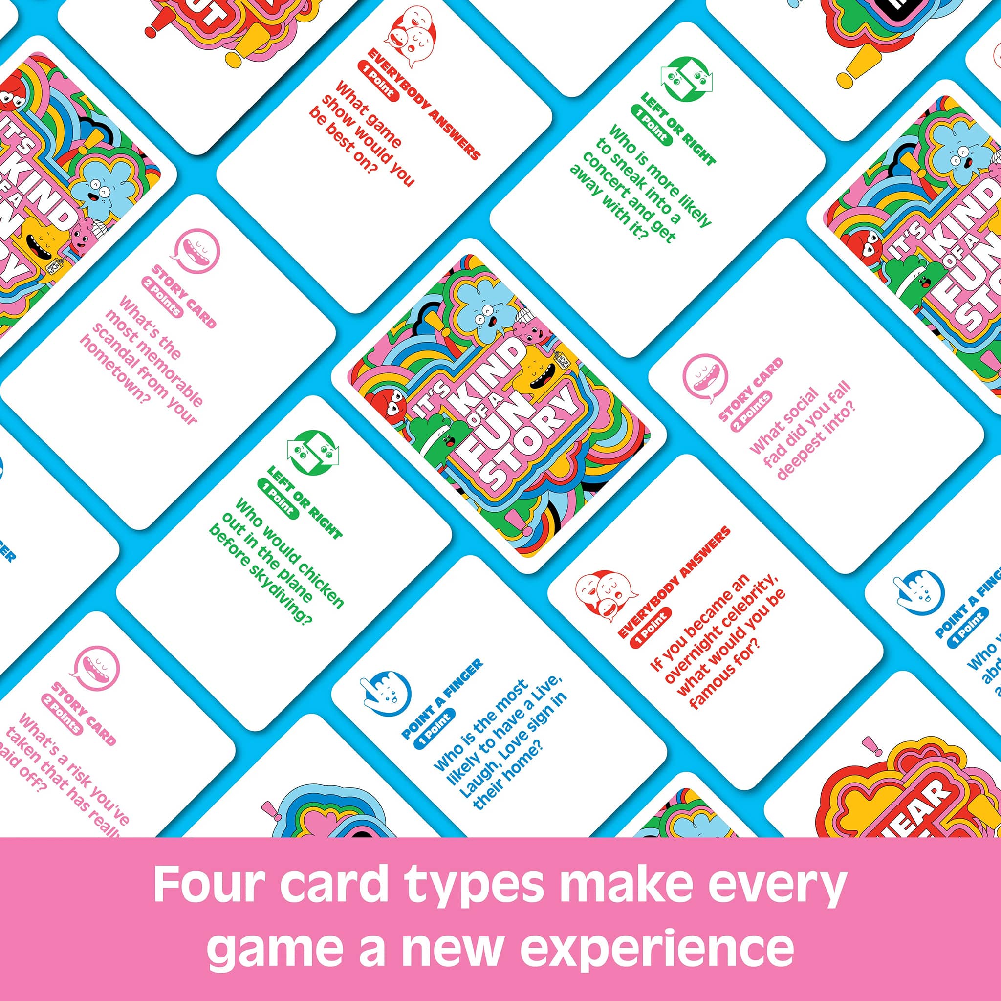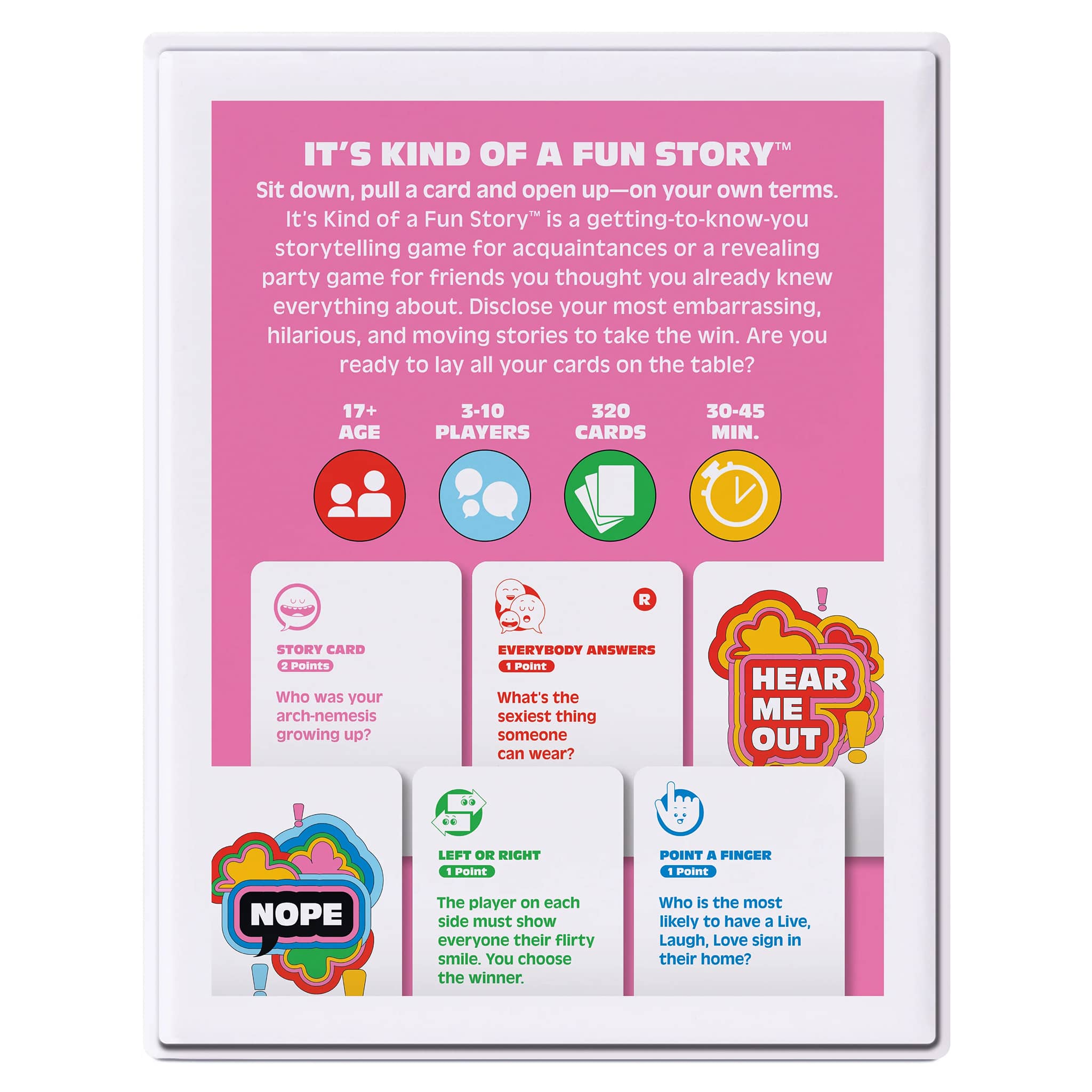 It's so easy to learn and fun to play! Take turns drawing cards and answering questions to be the first player to earn seven points. Story Cards put you in the spotlight to tell a story from your life, but watch out, if another player thinks they have a better tale, they can play a Hear Me Out Card to try to steal your points. Left or Right, Point a Finger, and Everybody Answers cards keep every round fresh, fast-paced, and full of surprises.