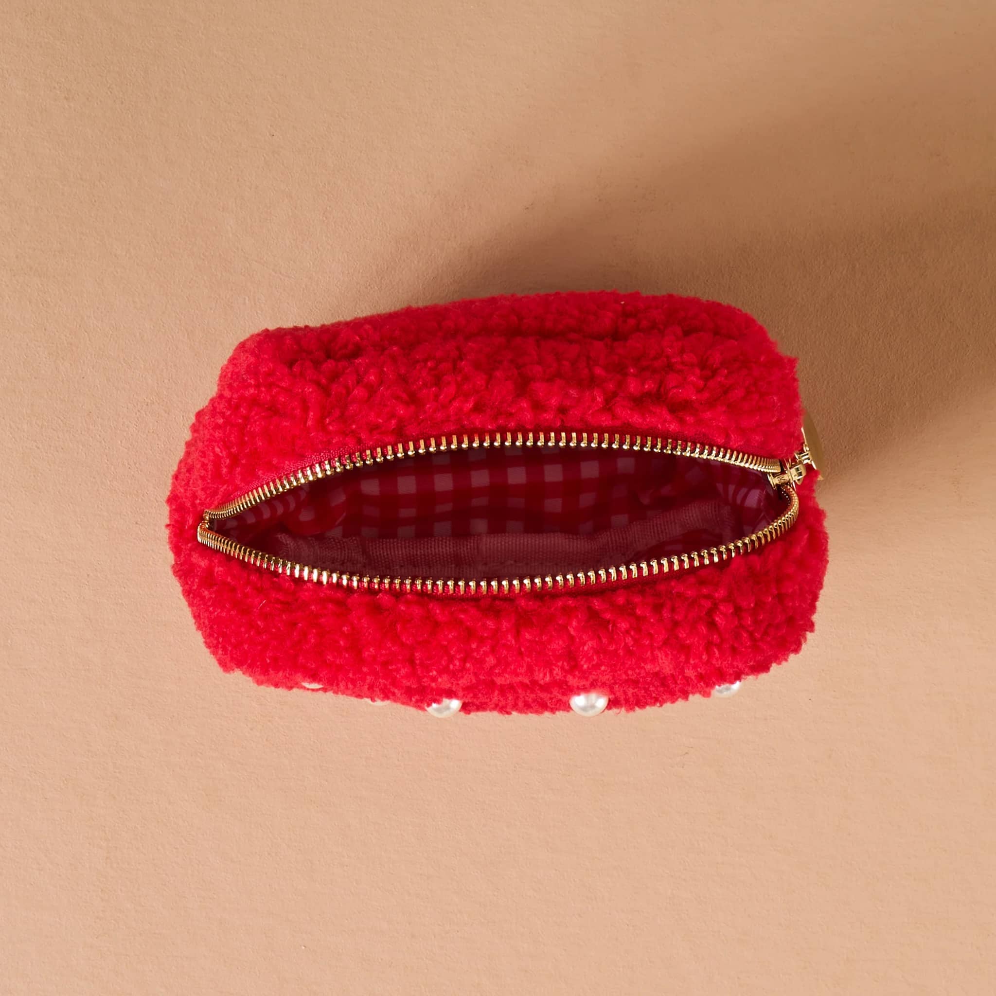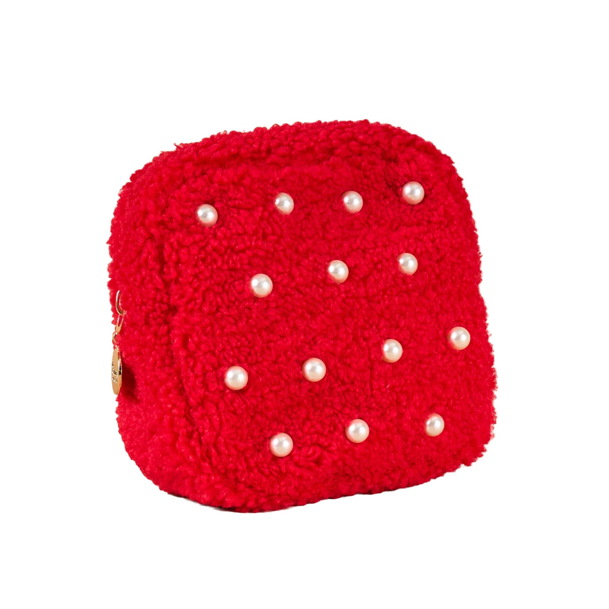 Add a cozy and functional accessory to your collection with the Square Teddy Pouch. Made from soft sherpa fabric, this pouch features a wipeable lining for easy maintenance and a gold zipper for a touch of elegance. The medium square size is perfect for keeping smaller essentials organized. Red sherpa fabric is studded with white pearl beads. Measures 6.5 x 6.5 x 2.5 inches. Makes a great Valentine's Day gift!