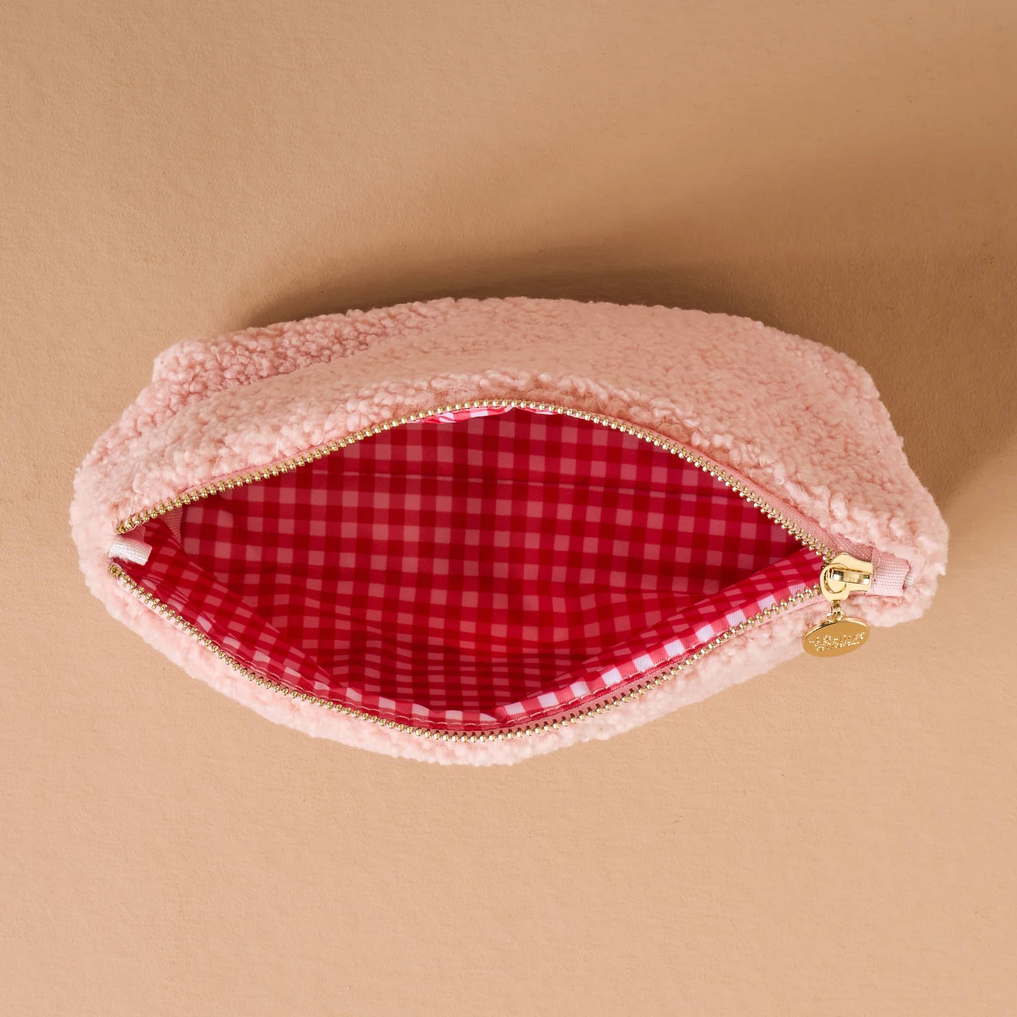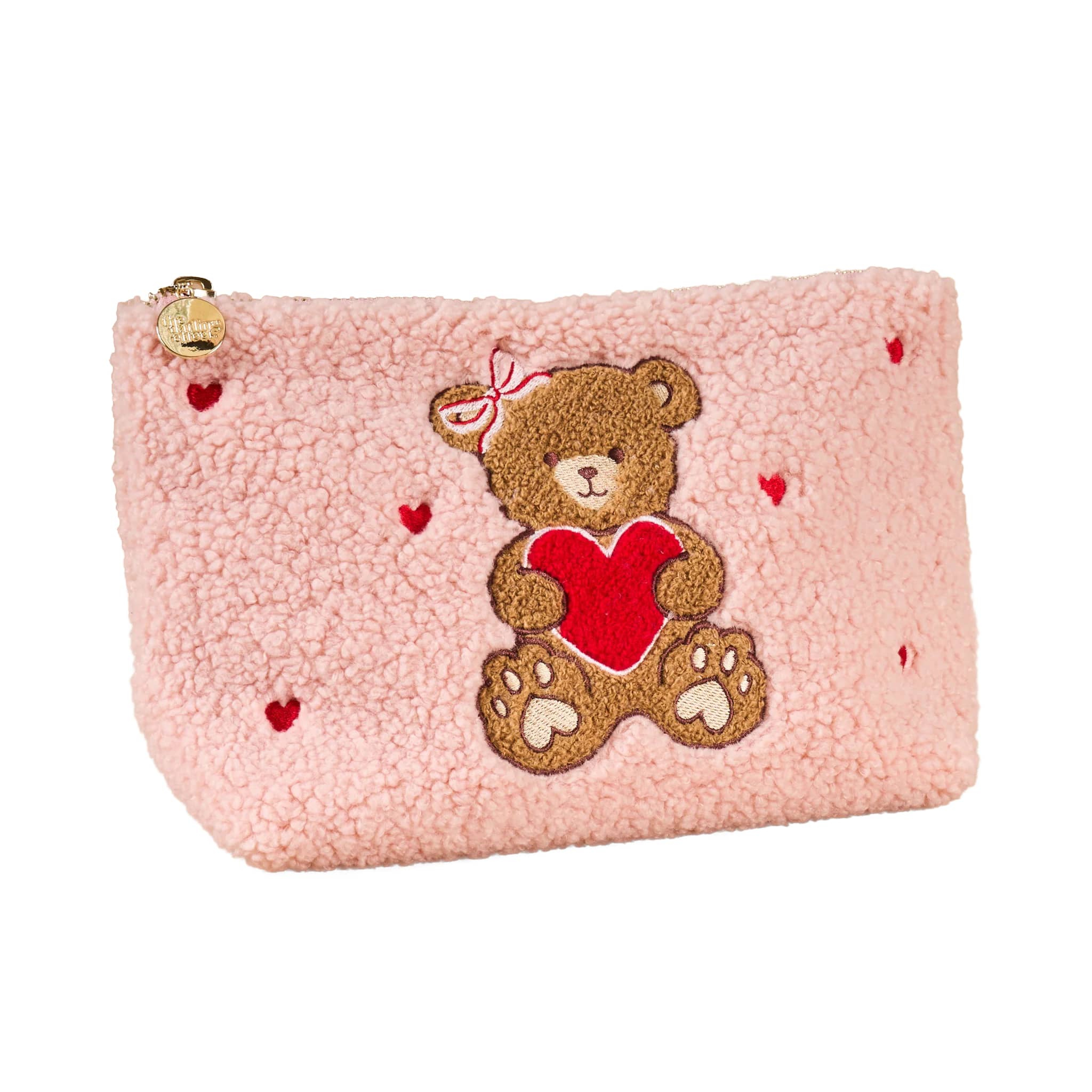 Add a cozy touch to your essentials with this Rectangle Teddy Pouch. Crafted from soft sherpa fabric, this pouch features a wipeable lining for easy cleaning and a gold zipper for a polished look. The interior is lined with a fun printed fabric, making it as stylish on the inside as it is on the outside. Cute, cozy, and full of love, this pouch is the perfect way to elevate your accessory game this season! The blush pink sherpa fabric has an adorable embroidered teddy bear hugging a red heart, surrounded by little red hearts. Pouch size is 10 x 3.5 x 6 inches.