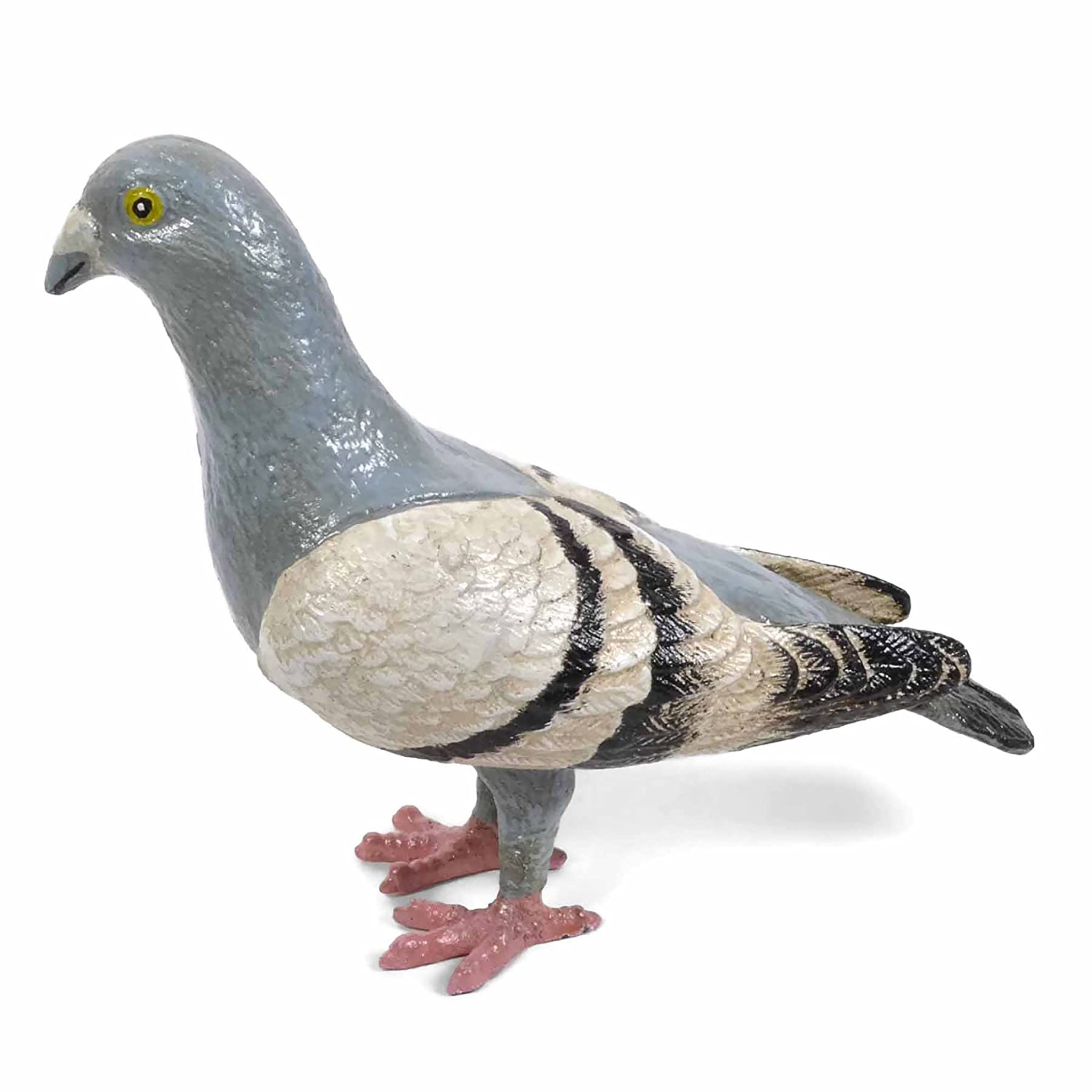 Looking for a low-maintenance pet? This heavyweight cast iron pigeon is for you! Though very lifelike, he doesn't need food or water, and won't make a mess. Pigeons are an NYC icon, so show them some love with this decorative sculpture. Hand painted in shades of gray, white and black with a lightly distressed and weathered finish to give it a vintage antique look. Due to hand finishing, variations should be expected. Display it on a shelf or mantel, along a garden path, or use as a doorstop. Measures 7.5 x 3 x 6.5 inches.
