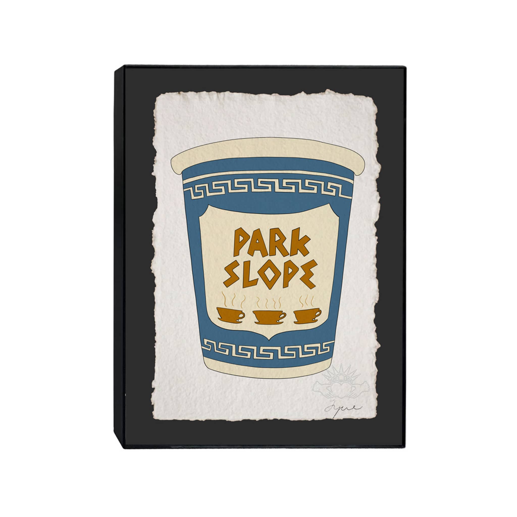 Features the classic Greek Coffee Cup with "Park Slope" written in the iconic font. Illustrated by hand and printed on handmade recycled cotton rag paper. The artwork is float-mounted on a black backing and placed inside a slim matte black plastic 5x7 inch frame with glass. Each print is signed by the artist in pencil at the bottom left and embossed with the FYRNE logo. Ready to hang or display with the included easel back.