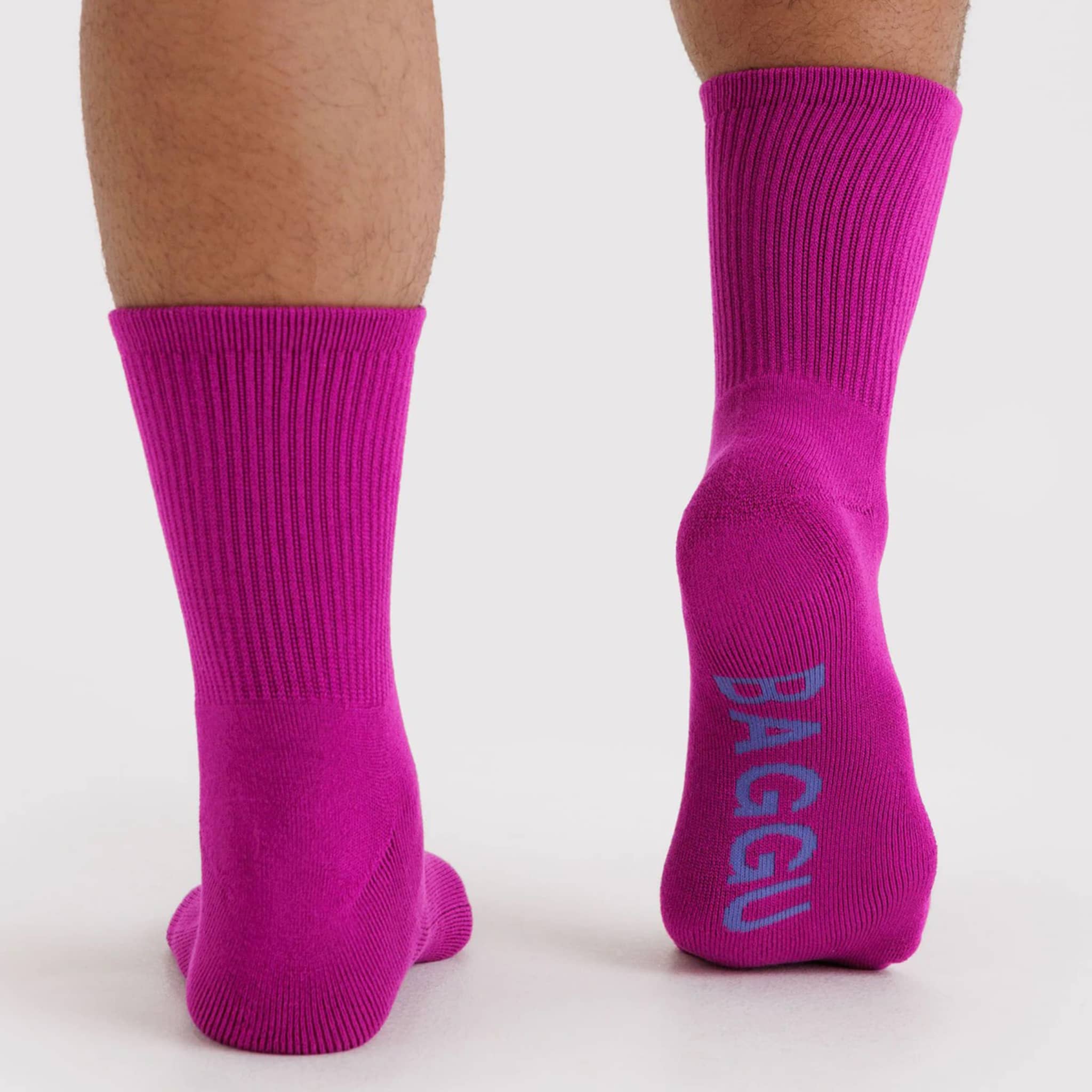 These Ribbed Socks in Deep Fuchsia from BAGGU are a treat for your feet! These solid fuchsia socks are perfect for wearing all day, every day, anywhere and everywhere. They're soft, stretchy, thick, and colorful, with a looped footbed for extra comfort. Woven from soft and stretchy bamboo rayon with poly/nylon elastic. One size, fits US women’s 6–11 or US men’s 4.5–9.5. Machine washable, includes 1 pair of socks.