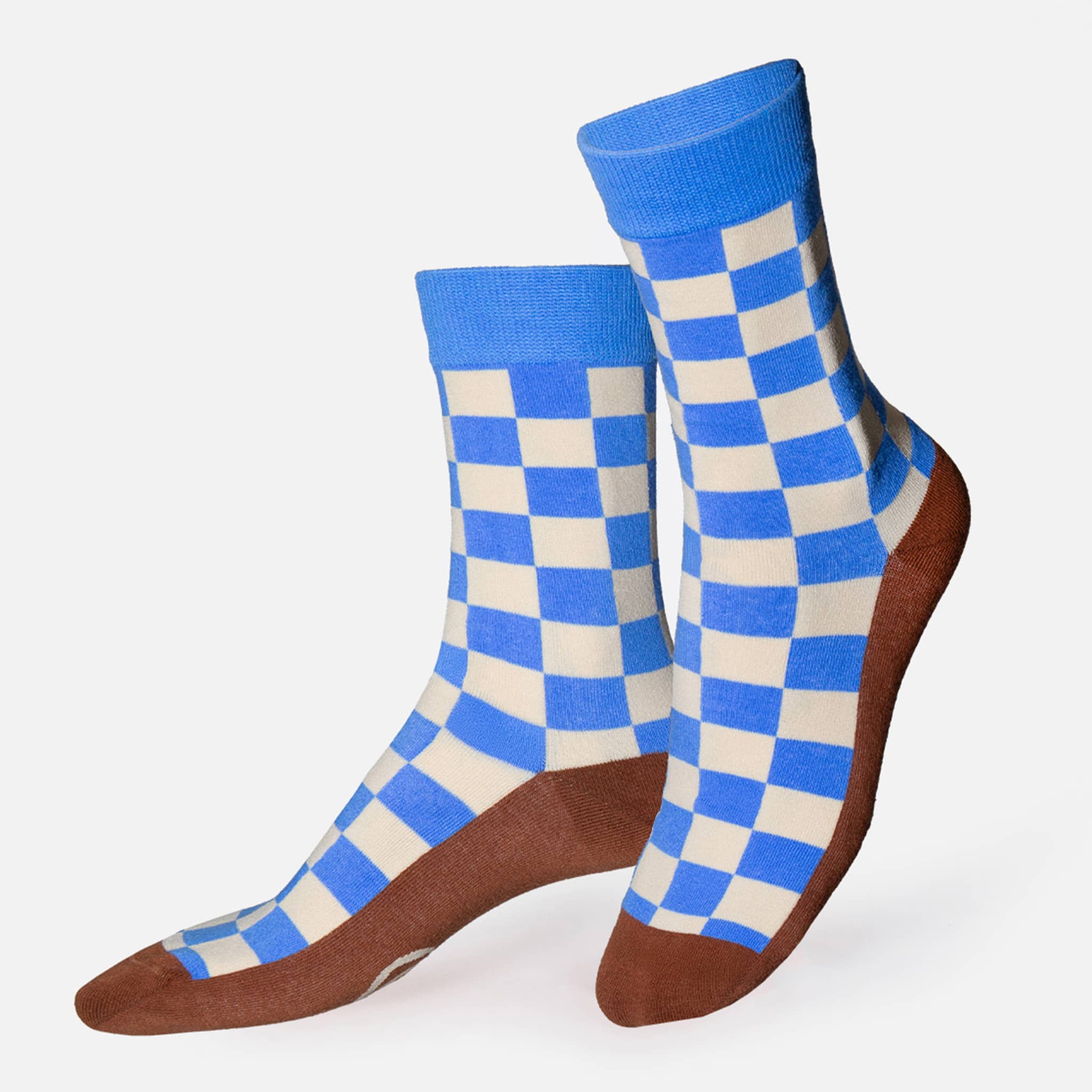The pair of unisex socks with blue and white checker design and brown soles comes packaged to look like a latte in the classic Greek coffee cup design. These fun and comfy crew socks are made from a blend of 43% cotton, 32% polyester, 22% polyamide, 2% elastane, and 1% elastodiene. One size fits most, machine washable, fit US women sizes 5 to 11, men sizes 4 to 10.